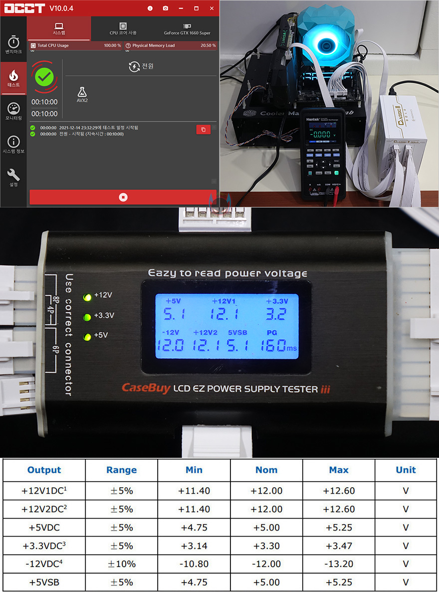 그럼, 이제 마이크로닉스의 클래식2 80PLUS GOLD 230V EU 풀모듈러 화이트 파워서플라이를 직접 사용해보는데, OCCT 프로그램을 통해 Idle과 과부하 Load 상태에서 12V와 5V 주요 전압의 변동을 측정하기 전, 기본 전압출력 상태를 확인해보면, 인텔 파워서플라이 가이드 표준범위에서 안정적으로 출력되는 것을 확인할 수 있습니다. 또한, 기존 블랙색상 제품과 마찬가지로 화이트제품도 팬리스 모드를 On/Off 할 수 있는 스위치가 있어서, 팬리스(Fanless) 모드를 선호하는 않는 소비자라면 팬 기본작동모드로 사용할 수 있습니다.