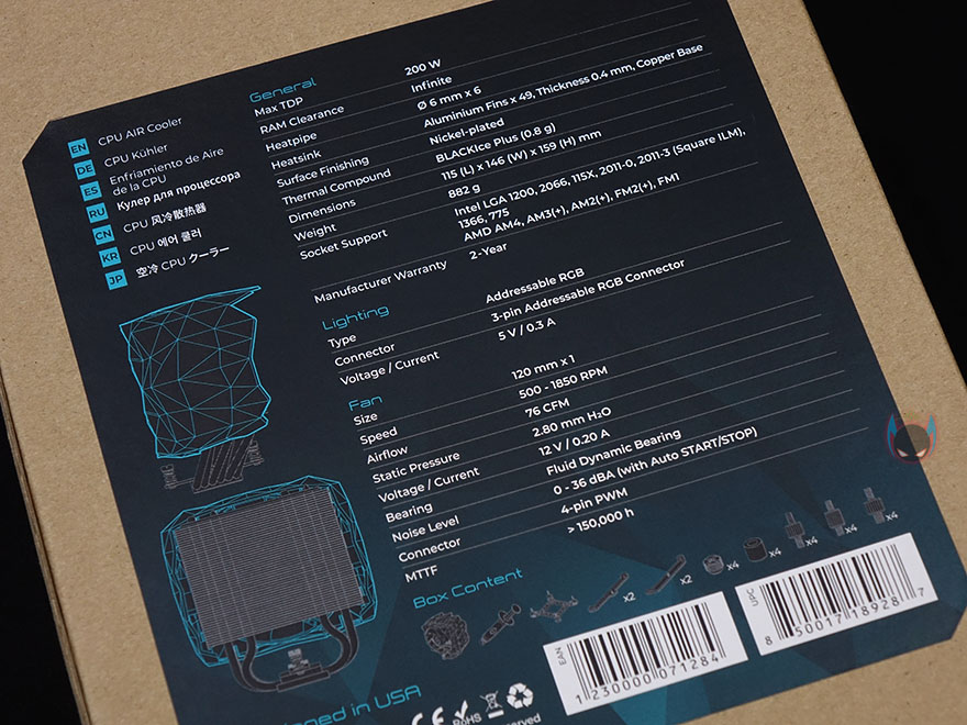 제품 팩키지는 박스형태로 디자인은 의외로 단순합니다. 오히려 이 다음에 출시된 그러니깐 다음 시간에 만나볼 모델에선 팩키지 디자인에 신경을 쓴 모습을 보여주죠. 아무튼 제품 박스에는 모델명정도만 새겨져 있는데, Iceberg-Thermal의 모든 쿨러 제품들은 IceSLEET 이름을 달고 있습니다. 그러니깐 IceSLEET 시리즈가 되는거죠. 물론, 요즘 트랜드에 맞춰서 나왔기 때문에 RGB 라이팅효과 표기도 해놨고, 박스후면에 제품의 기본 사양표기도 확인할 수 있습니다.