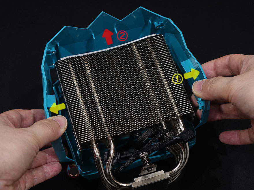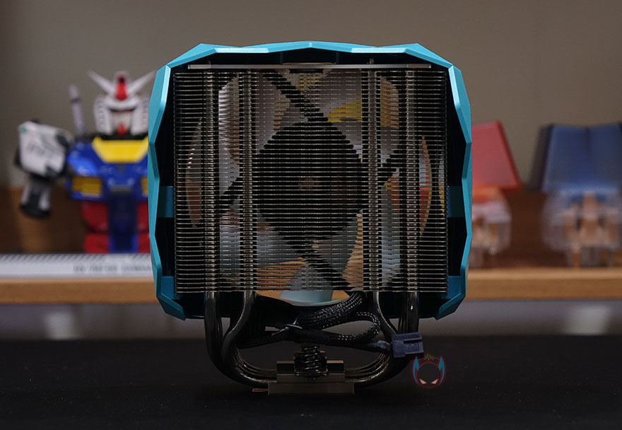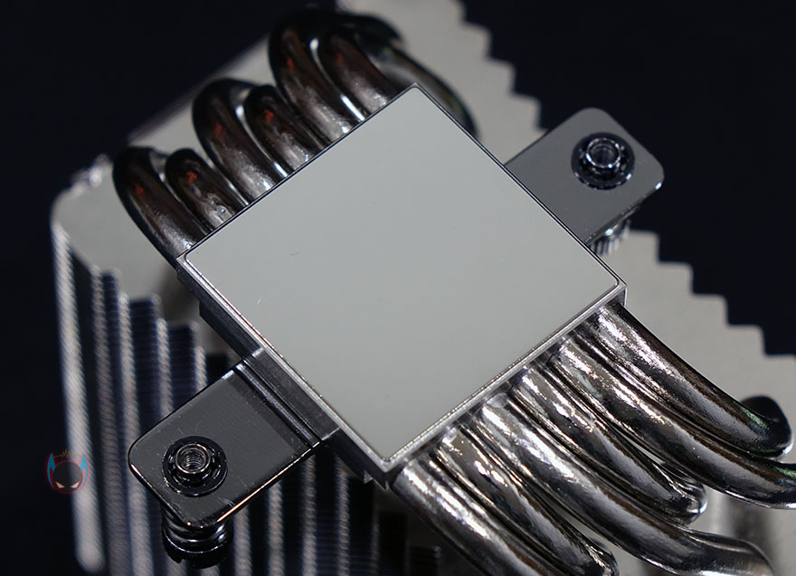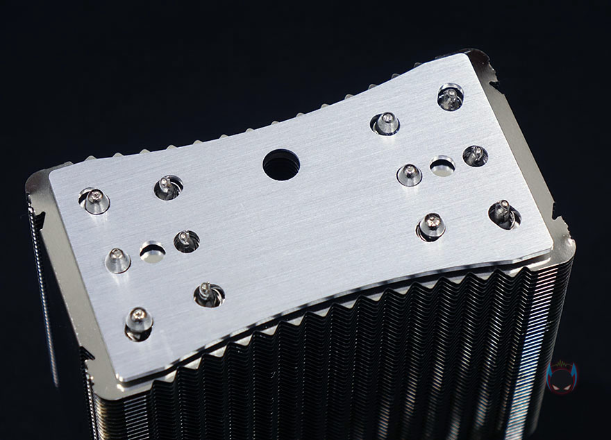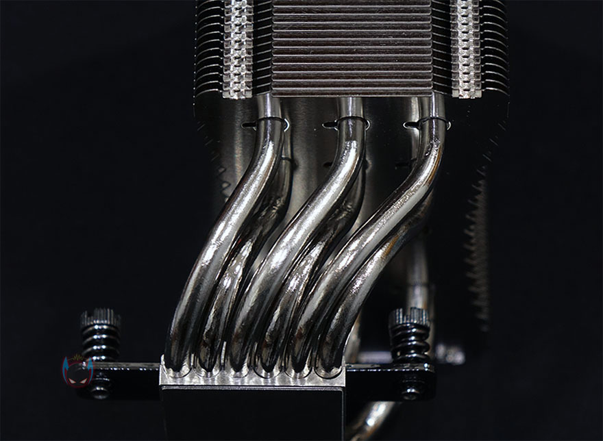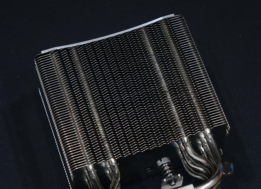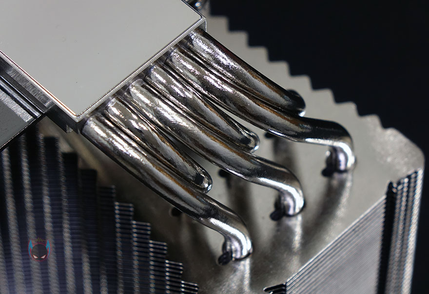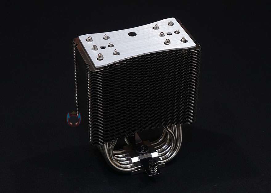 커버를 분리한 상태에서 이번엔 히트싱크를 살펴보는데, 방열핀 맨 상단부분을 제외하고는 모두 동일한 디자인의 방열핀을 갖추고 있으며, 방열핀은 총 49개가 사용되었습니다. 커버가 적용되었기 때문에, 방열핀 측면도 막혀있는 형태로 처리해놨으며, 측면에서 보면 히트파이프가 후면방향으로 쏠린 것을 확인할 수 있죠. 이런 쏠림 디자인은 모두 메모리슬롯과의 간섭해결을 위해서입니다. 히트파이프는 지름 6mm로 총 6개가 사용되었는데, 그럼 왜 모델명에 X6이 붙었는지 쉽게 알 수 있죠. 또한, 방열핀과 통과하는 방식은 솔더링 방식이며, 방열핀과 히트파이프 모두 니켈 도금처리에 CPU와 맞닿는 베이스부분도 니켈 도금처리로 사물이 비칠정도의 반사율과 매끄러운 래핑처리를 해놨습니다.