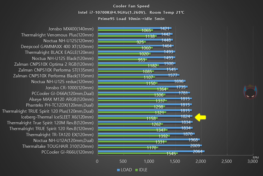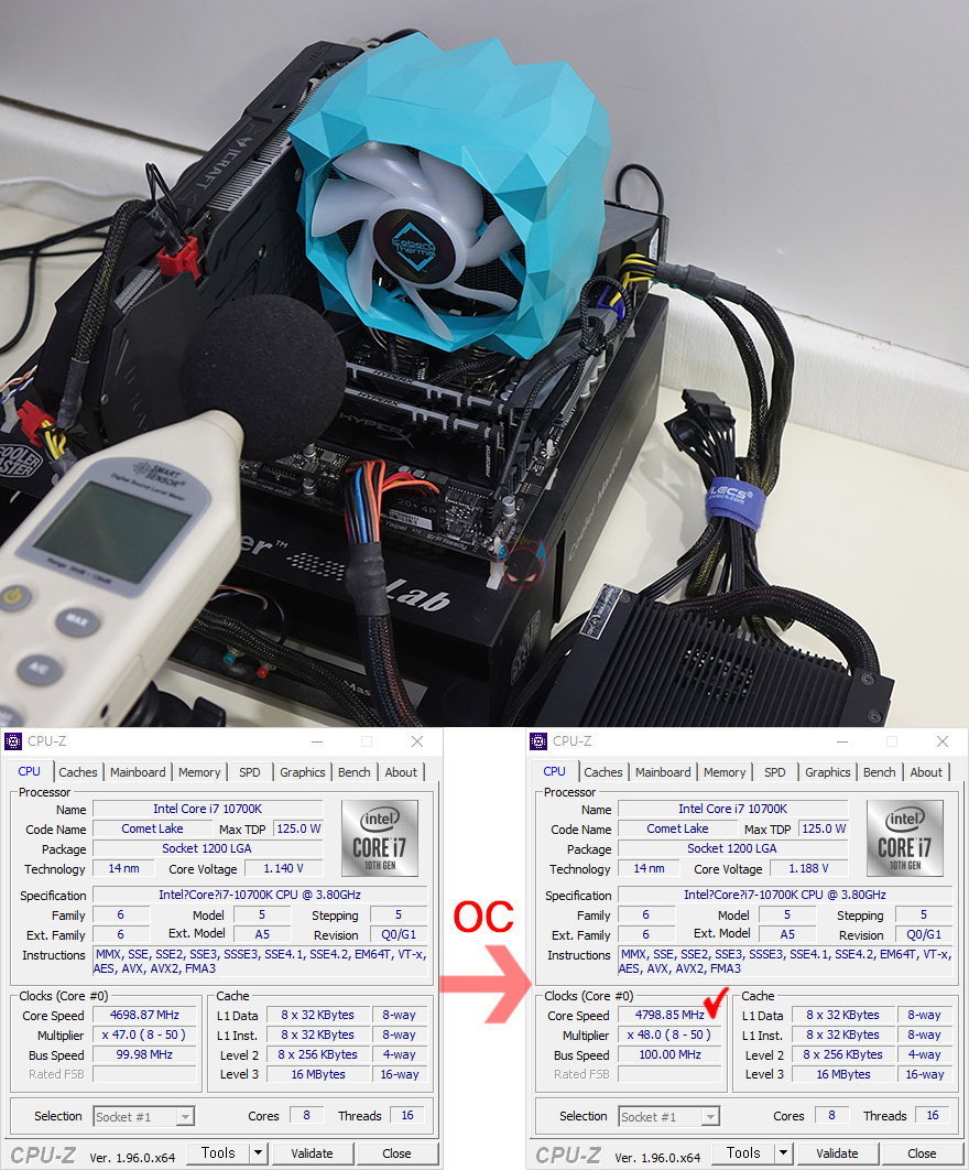 이제, IceSLEET X6 쿨러의 성능을 확인해보는데, 인텔 i7-10700K CPU를 사용해 1차(4.8GHz)와 2차(4.9GHz) 오버클럭으로 각각 나뉘어 Prime95 프로그램을 통해 100% 과부하의 Load 상황 10분 후, 5분 Idle로 돌아가는 상황에서 CPU 온도와 메인보드 전원부에 쿨링영향을 확인해보고, 2차 오버클럭에서 팬 속도와 소음을 측정해봤습니다. 팬 작동은 메인보드에 PWM 방식에 바로 연결했으며, 소음측정을 위해 파워서플라이는 팬리스(Fanless) 제품을 사용했습니다.