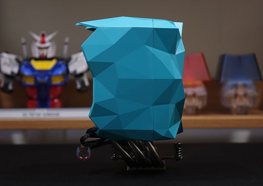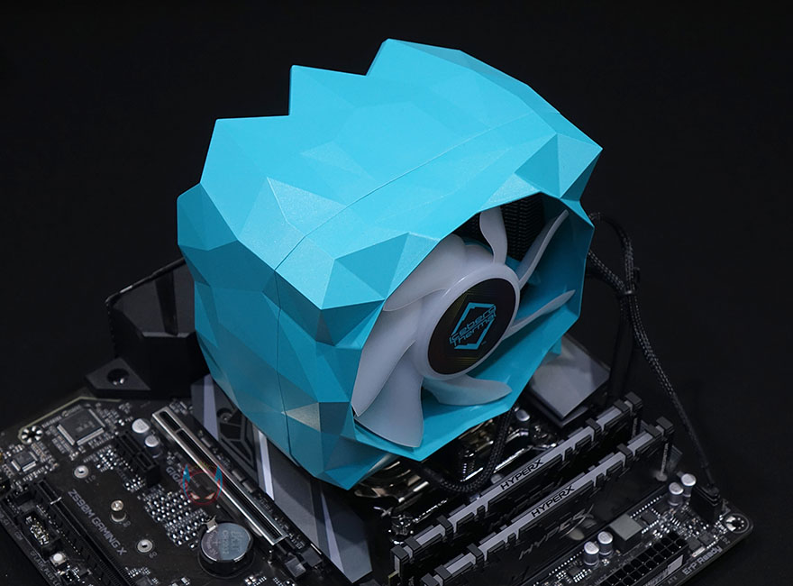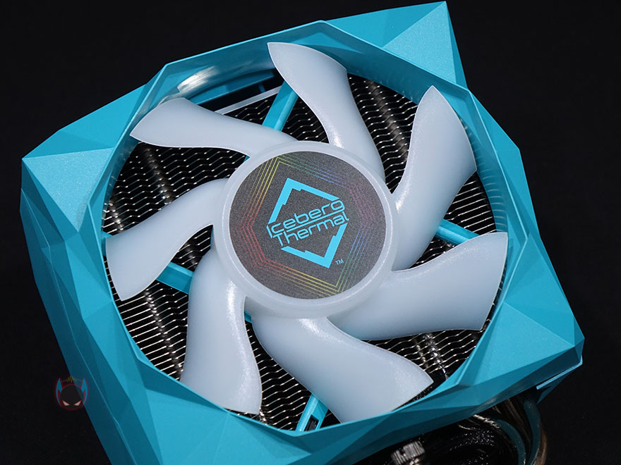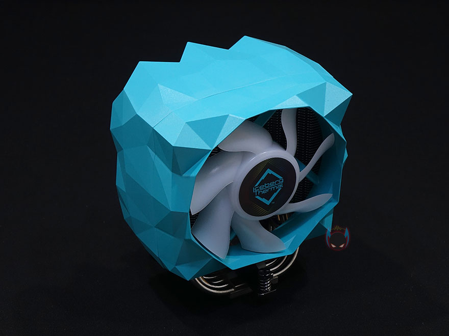 그럼, 본격적으로 Iceberg-Thermal(아이스베르그-써멀)의 IceSLEET X6 CPU쿨러를 살펴보는데, 눈에 가장 먼저 들어오는 부분은 디자인부분으로 실제로 자사에 첫 제품을 출시했을 때 주목을 받은 부분이기도 합니다. IceSLEET X6 쿨러는 덕트형태의 커버를 적용하고 있는데 마치 크리스탈 입체모양 같은 디자인으로 적용되어 있죠. 기존에도 여러 CPU쿨러 제품들이 커버를 적용한 경우가 있었지만, IceSLEET X6는 시선을 사로잡을만큼 독특하다할 수 있습니다. 그리고, 전면에는 120mm 사이즈의 팬이 적용되어 있는데, 뒤에서 작동할 때 확인하겠지만 RGB 라이팅효과를 지원하고 있습니다.