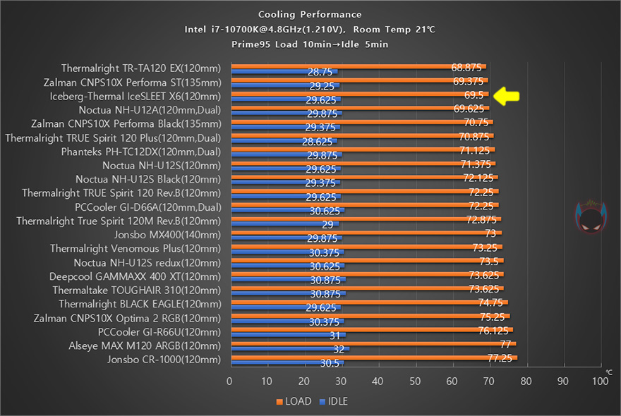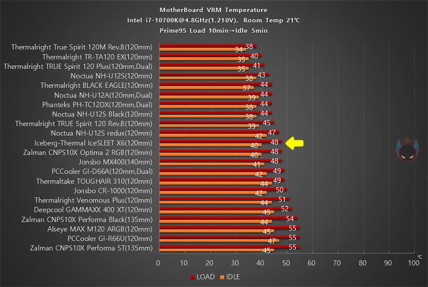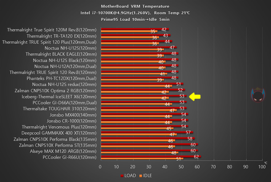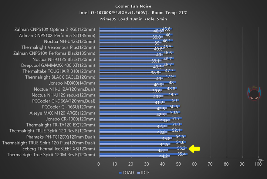 이제, IceSLEET X6 쿨러의 성능을 확인해보는데, 인텔 i7-10700K CPU를 사용해 1차(4.8GHz)와 2차(4.9GHz) 오버클럭으로 각각 나뉘어 Prime95 프로그램을 통해 100% 과부하의 Load 상황 10분 후, 5분 Idle로 돌아가는 상황에서 CPU 온도와 메인보드 전원부에 쿨링영향을 확인해보고, 2차 오버클럭에서 팬 속도와 소음을 측정해봤습니다. 팬 작동은 메인보드에 PWM 방식에 바로 연결했으며, 소음측정을 위해 파워서플라이는 팬리스(Fanless) 제품을 사용했습니다.