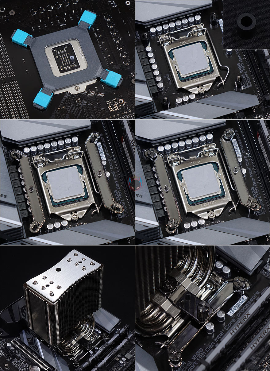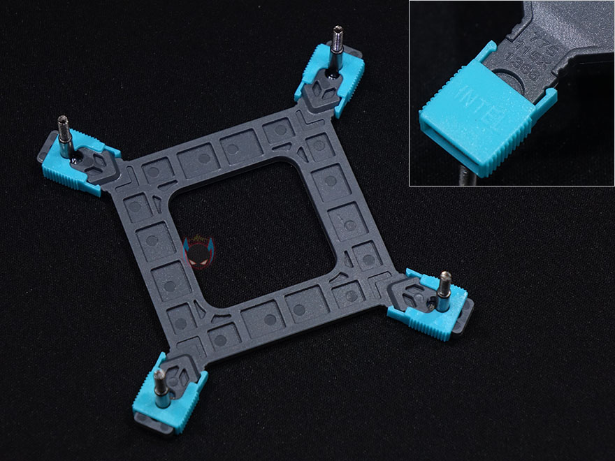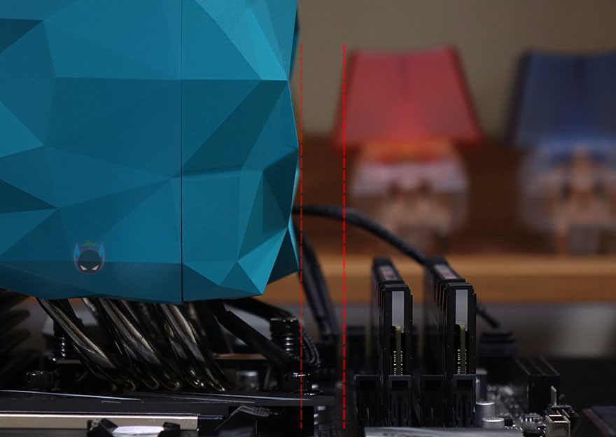 그럼, 이제 IceSLEET X6 쿨러를 사용해보는데, 장착은 앞서 부속품에서 확인해듯이 소켓별로 나사와 볼트가 각각 동봉되어 있기때문에, 자신이 사용하고 있는 CPU 소켓에 맞춰서 사용하면 됩니다. 참고로, 4개의 동봉비닐 중 아무것도 표기되지 않은 것은 인텔 LGA 775/115x/1200/1366용 나사와 볼트가 들어있습니다. 부품이 가장 많이 사용되는 인텔 LGA 775/115x/1200/1366 소켓 CPU 기준에서 장착법을 설명해보자면, 먼저 백플레이트를 CPU 소켓 규격에 맞춘 후, 메인보드에 끼웁니다. 그리고, 스탠드오프를 끼워주고, 그 위에 인텔용 브라켓을 올려주고, 그 다음 볼트로 체결해줍니다. 그리고, 팬과 커버를 분리한 상태에서 히트싱크를 올려서 브라켓과 체결해주고, 마무리도 팬과 커버를 다시 장착해줍니다. 커버가 적용되어 있지만, 장착법은 의외로 쉬운 편이기때문에 초보자도 크게 어려움은 없겠으며, 장착 후 메인보드의 메모리슬롯과의 간섭여부를 확인해보면, 가장 가까운 1번 슬롯과 간섭이 없는 것을 확인할 수 있습니다.