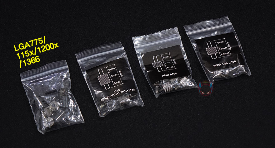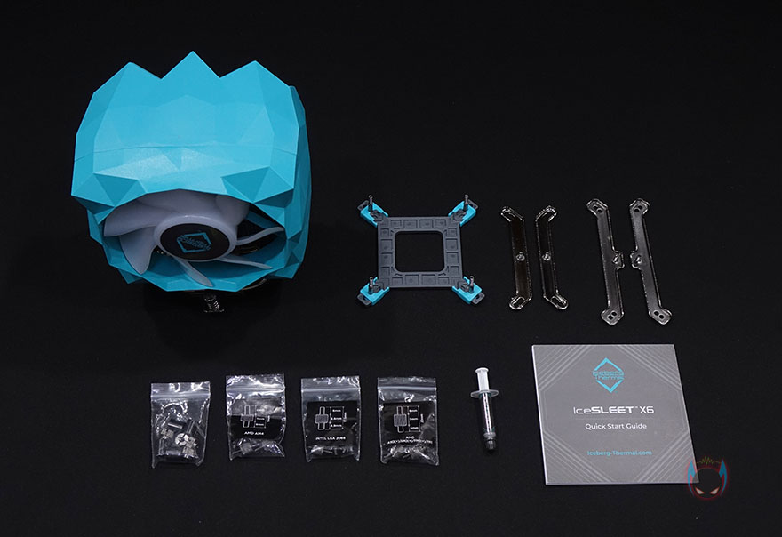 박스를 열어보면 겉박스 디자인과 달리 포장은 나름 신경을 썼습니다. 쿨러와 부속품을 따로 나뉘어서 속박스 포장을 해놨고, 쿨러는 포장재까지 사용하고 있죠. 제품구성은 IceSLEET X6 쿨러, LGA 775/115X/1200/1366용 백플레이트, 인텔용 브라켓, AMD용 브라켓, 소켓별 나사와 볼트, 소량의 써멀컴파운드, 제품설명서로 이루어져 있습니다. 소켓별 나사와 볼트는 분실되지 않게 나뉘어서 동봉되어 있는데, 뒤에 장착할 때 다시한번 확인하겠습니다.
