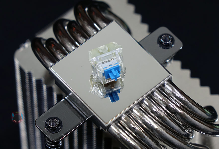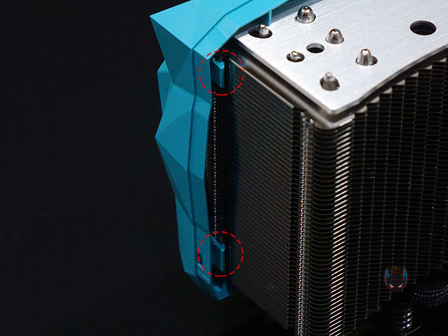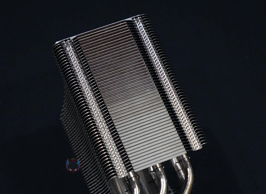 커버를 분리한 상태에서 이번엔 히트싱크를 살펴보는데, 방열핀 맨 상단부분을 제외하고는 모두 동일한 디자인의 방열핀을 갖추고 있으며, 방열핀은 총 49개가 사용되었습니다. 커버가 적용되었기 때문에, 방열핀 측면도 막혀있는 형태로 처리해놨으며, 측면에서 보면 히트파이프가 후면방향으로 쏠린 것을 확인할 수 있죠. 이런 쏠림 디자인은 모두 메모리슬롯과의 간섭해결을 위해서입니다. 히트파이프는 지름 6mm로 총 6개가 사용되었는데, 그럼 왜 모델명에 X6이 붙었는지 쉽게 알 수 있죠. 또한, 방열핀과 통과하는 방식은 솔더링 방식이며, 방열핀과 히트파이프 모두 니켈 도금처리에 CPU와 맞닿는 베이스부분도 니켈 도금처리로 사물이 비칠정도의 반사율과 매끄러운 래핑처리를 해놨습니다.
