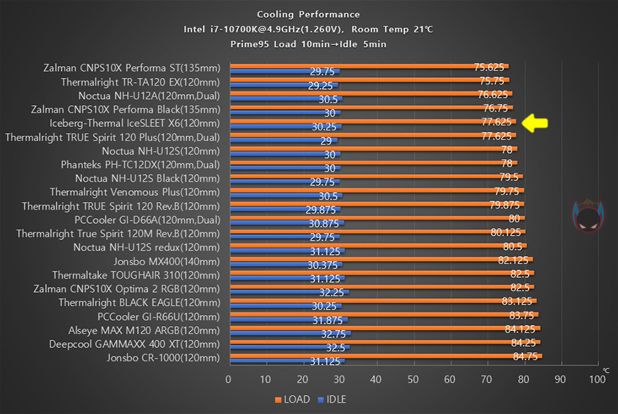 먼저, 1차(4.8GHz) 오버클럭 상황에서 CPU 온도를 확인해보면, 전체 비교 쿨러들 중에서 3번째로 낮은 온도를 보여주면서 최상위 수준의 성능을 보여주는 것을 확인할 수 있습니다. 특히, 다른 120mm 쿨러들과 달리 IceSLEET X6는 커버 디자인이 적용된 형태임에도 좋은 쿨링성능을 보여준다라는 점이 인상적이라 할 수 있습니다. 메인보드 전원부에 쿨링영향은 전체 비교 쿨러들 중 중간정도의 성능으로 이는 커버디자인의 영향이라고 볼수도 있고, 아니면 팬이 일체형이기때문에 위치조절을 할 수 없는 점에서의 영향이라고도 볼 수 있습니다.
