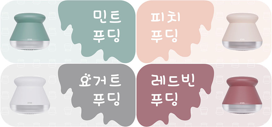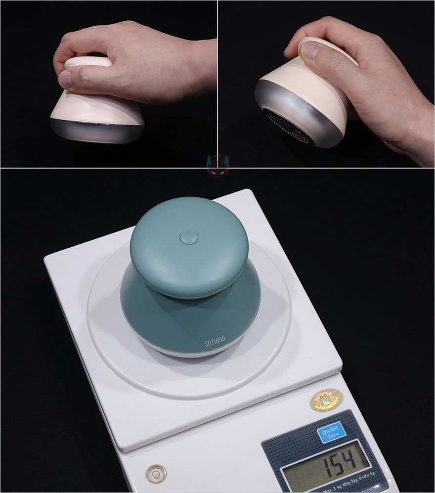 그럼, 본격적으로 소싱(Sothing) 푸딩 보풀제거기 제품을 살펴보면, 색상은 앞서 언급했듯이 총 4가지 색상으로 나왔는데, 민트/피치/요거트/레드빈이라는 명칭을 가지고 있으며, 다양한 색상이 있는만큼 소비자입장에선 선택의 폭, 그러니깐 개인 취향으로 선택할 수 있다라는 점에서 분명 좋은 점이라 할 수 있습니다. 그리고, 크기의 경우에도 84x79mm로 흔히 많이 보는 막대형 손잡이가 있는 보풀제거기보다 작기 때문에 휴대성도 더 좋다 할 수 있죠. 특히, 푸딩형상의 디자인을 가지면서 윗부분을 손잡이로 처리한 점은 개인적으로도 이 제품에서 가장 마음에 드는 부분이었습니다. 또한, 무게도 150g대로 스마트폰보다 가볍기 때문에 휴대성할때 무게감도 크게 느껴지지 않죠.