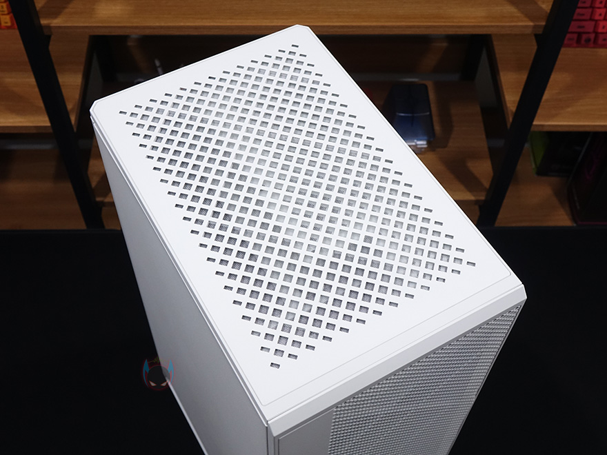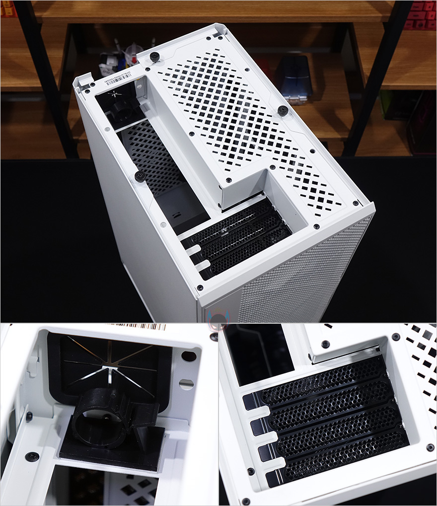 케이스 상단베젤 경우 역시 동일한 디자인의 메쉬 디자인을 적용하고 있으며, 자석방식으로 쉽게 분리가 되며, 안쪽에 필터가 역시 적용되어 있는 것을 확인할 수 있습니다. 그리고, 상단 베젤은 분리해서 내부를 잠깐 보면, 굴뚝형 케이스이기때문에, 메인보드 백패널 I/O 방향이 위로 노출되게 되어있으며, PCI슬롯도 확인할 수 있는데, 미니타워 기준인 4개를 갖추고 있습니다. 바로 뒤에서 확인하겠지만, 후면으로 케이블을 쉽게 빼낼 수 있게 묶을 수 있는 클램프도 적용되어 있죠.