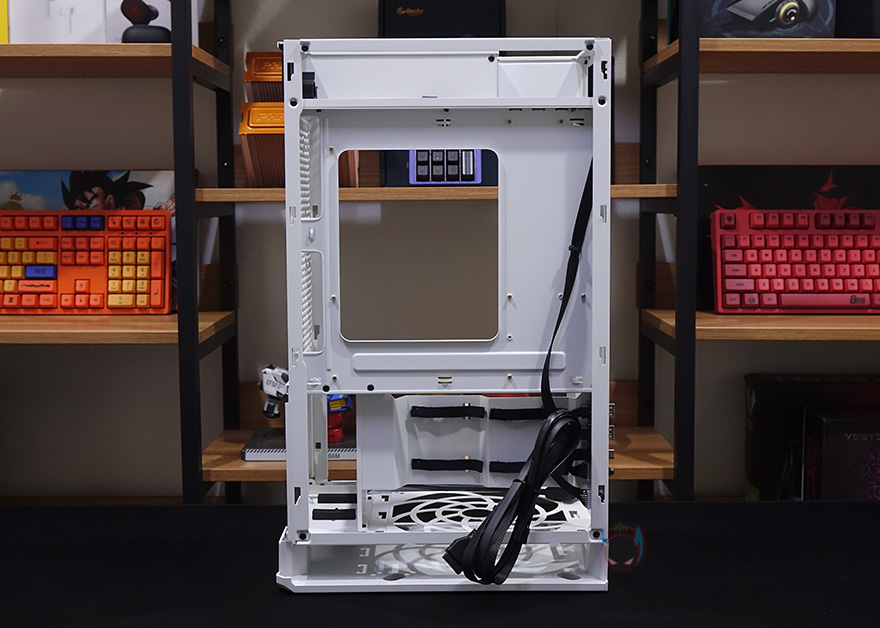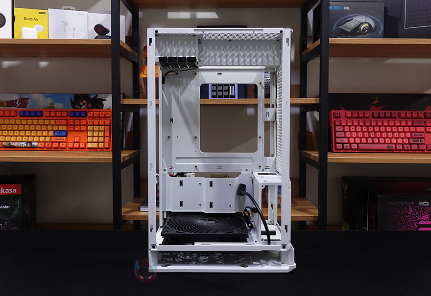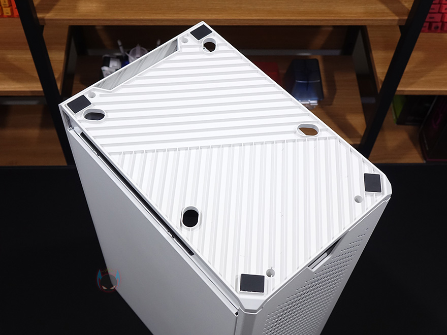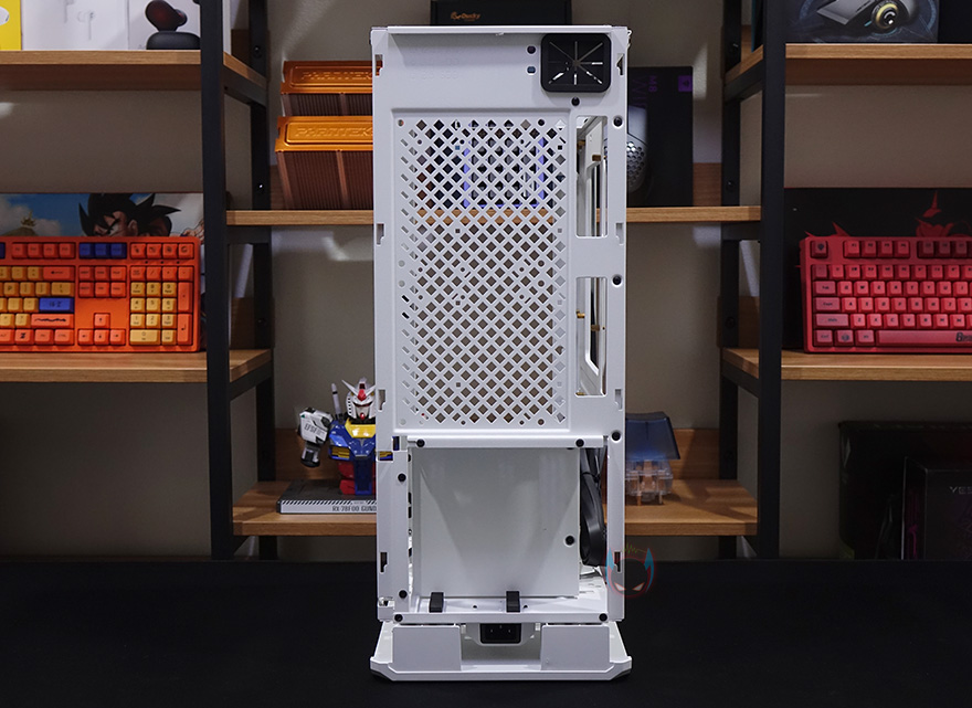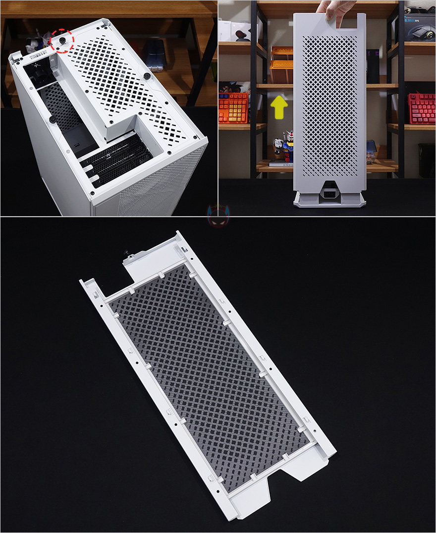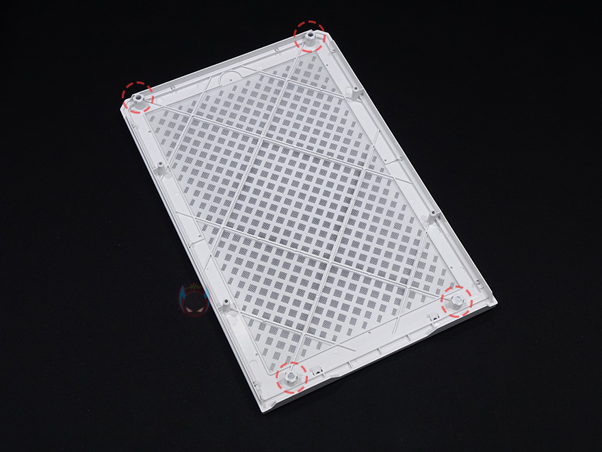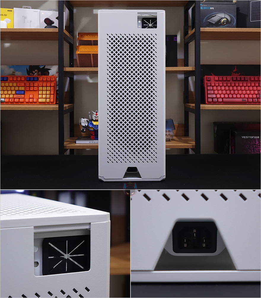 케이스 후면에는 전체적으로 메쉬(Mesh) 디자인을 적용하고 있는데, 맨 윗부분 오른쪽에는 메인보드 백패널 I/O가 상단에 배치되기때문에 키보드나 마우스, 모니터케이블 등을 후면으로 빼낼 수 있게 홀-처리를 해놨으며, 맨 아랫부분에는 전원케이블과 연결되는 포트가 배치되어 있습니다. 그리고, 후면 패널 역시 상단에서 고정된 핸드-스크류를 풀고 위로 올리면 쉽게 분리가 되죠. 역시 안쪽에는 필터가 적용되어 있습니다. 그리고, 케이스 밑바닥부분에는 미끄럼방지 및 진동소음 최소화를 위해 모서리 부근에 고무패드를 부착해놨으며, 밑바닥부분은 사실상 전체가 받침대 역할로 약 35mm 정도 공간을 두고 있습니다. 이 공간을 통해 하단 쿨링효과를 보는거죠. 그리고, 당연히 필터도 적용되어 있는데, 슬라이드 방식으로 쉽게 빼낼 수 있습니다.
