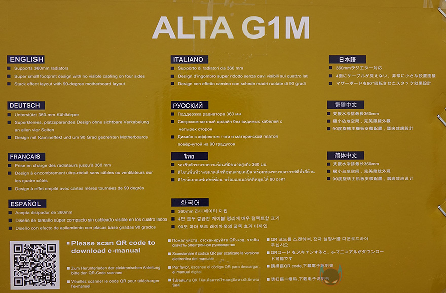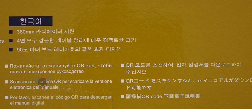 제품박스부터 살펴보면, 전후면에는 모델명과 함께 제품 이미지를 담고 있는데, 화이트와 블랙 2가지 색상으로 출시되었다라는 것을 쉽게 알 수 있습니다. 그리고, 모델명 아래에 컨셉문구를 통해 Micro-ATX 메인보드가 장착되는 PC케이스라는 것도 알 수 있죠. 물론, 박스 측면에 제품의 기본사양 표기를 확인할 수 있어서, 크기와 파워서플라이 규격, PCI슬롯 개수 등도 미리 알 수 있습니다. 또한, 반대쪽 측면에는 한국어를 포함해 11개국 언어로 제품 주요 특징을 표기해놨으며, 아래에 QR코드를 통해 전자식 제품설명서를 다운로드 받아야한다고 명시도 되어있습니다. 즉, 종이 인쇄로 제품설명서가 들어있지 않다라는거죠.