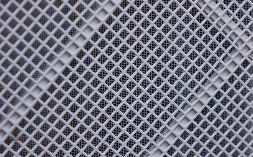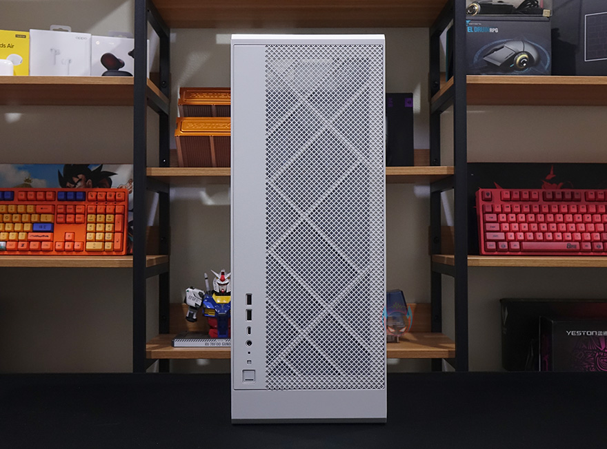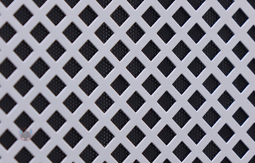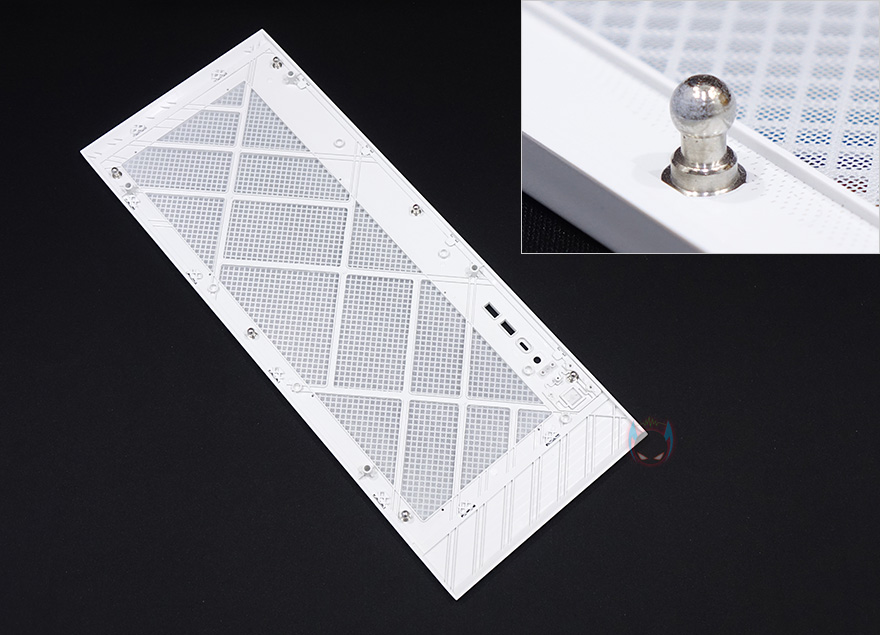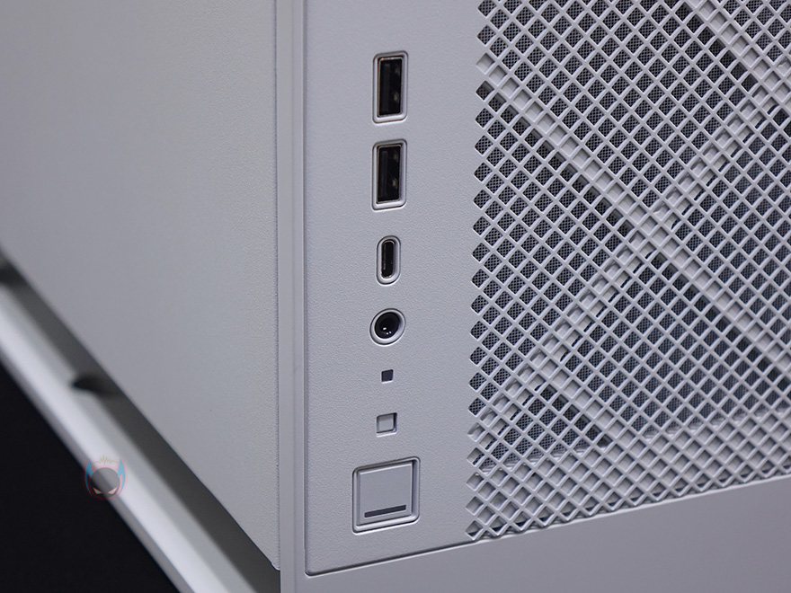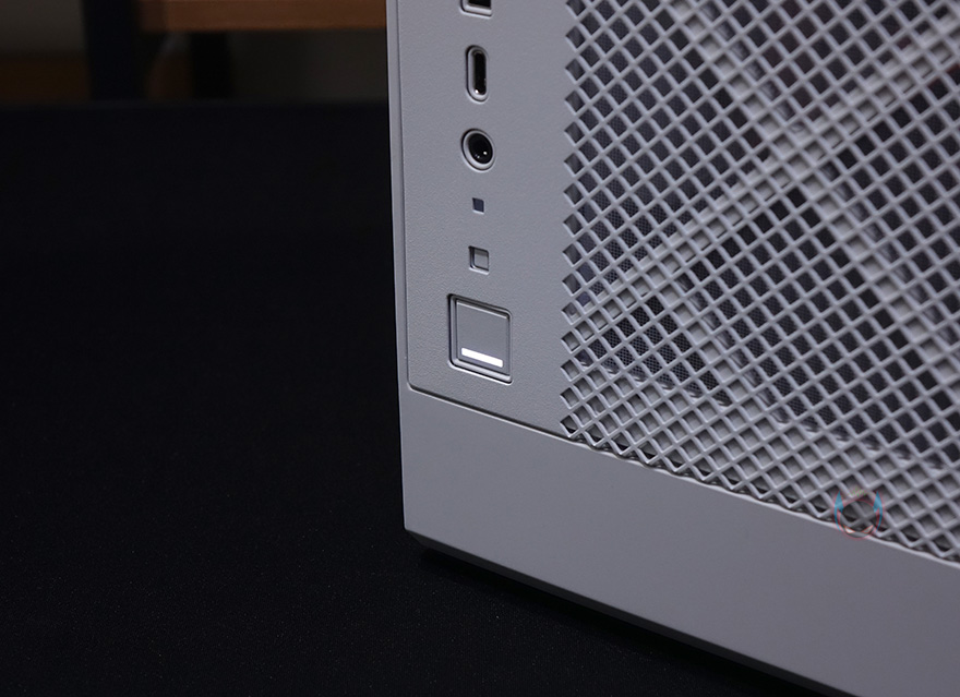 좀 더 자세히 살펴보면, 전면베젤은 4/5가량이 메쉬(Mesh) 디자인의 에어홀을 적용하고 있는데, 가까이에서 보면 안쪽에 필터도 장착된 것을 확인할 수 있습니다. 그리고, 전면에서 봤을 때 왼쪽 아랫부분에 버튼 및 포트가 배치되어 있는데, 위에서부터 USB 3.0 포트 2개, USB Type-C 포트 1개, 리셋버튼, 전원버튼순으로 나열되어 있습니다. 전면베젤은 핀(Pin) 방식으로 장착되어 있어서, 쉽게 분리할 수 있습니다.