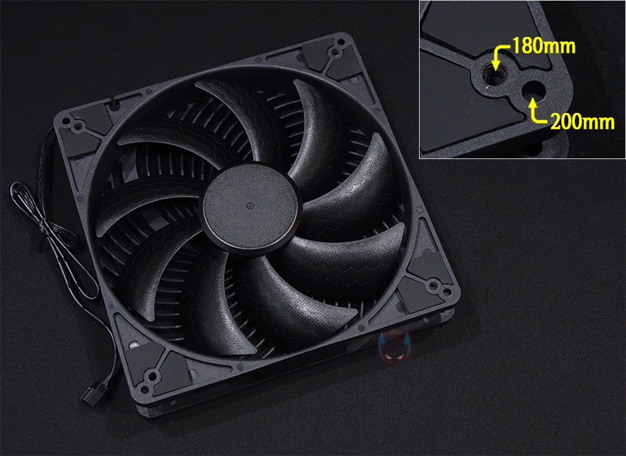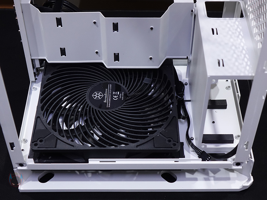 브라켓을 분리한 후 내부를 다시 보면, 윗공간은 메인보드가 장착되는 트레이부분으로 큼지막한 CPU-cut-Out 처리와 함께 Mini-ITX와 Micro-ATX 규격의 메인보드를 장착할 수 있으며, 맨 아랫공간에는 하단 쿨링효과를 위해 180mm 대형 팬이 장착된 것을 확인할 수 있습니다. 물론, 외부 밑바닥부분에서 팬 고정 스크류를 풀면 쉽게 분리가 됩니다. 참고로, 이 180mm 팬 경우 크기는 180mm지만, 장착을 해주는 스크류-홀 규격은 180/200mm 2가지로 되어있어서, 호환성이 좀 더 넓죠. 조금 아쉬운 점이라면, 실버스톤 팬 제품 중에 동일한 사양으로 ARGB 팬도 있어서, 기왕이면 ARGB 팬으로 제공해주었으면 시각적인 효과도 있어서 좀 더 좋지 않았을까 생각이 들었습니다.