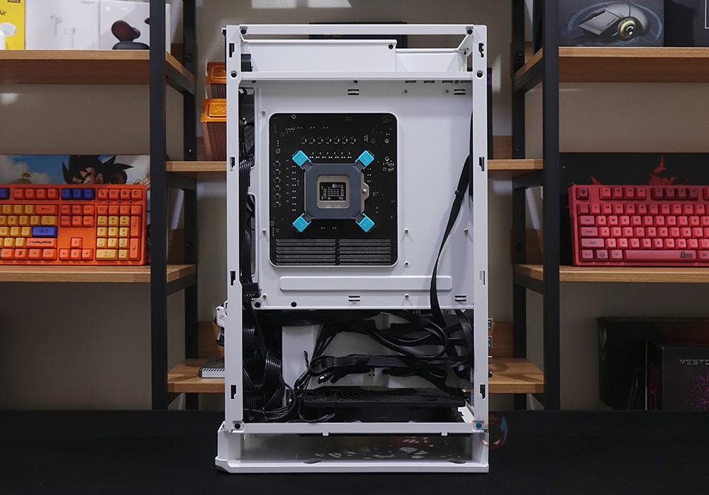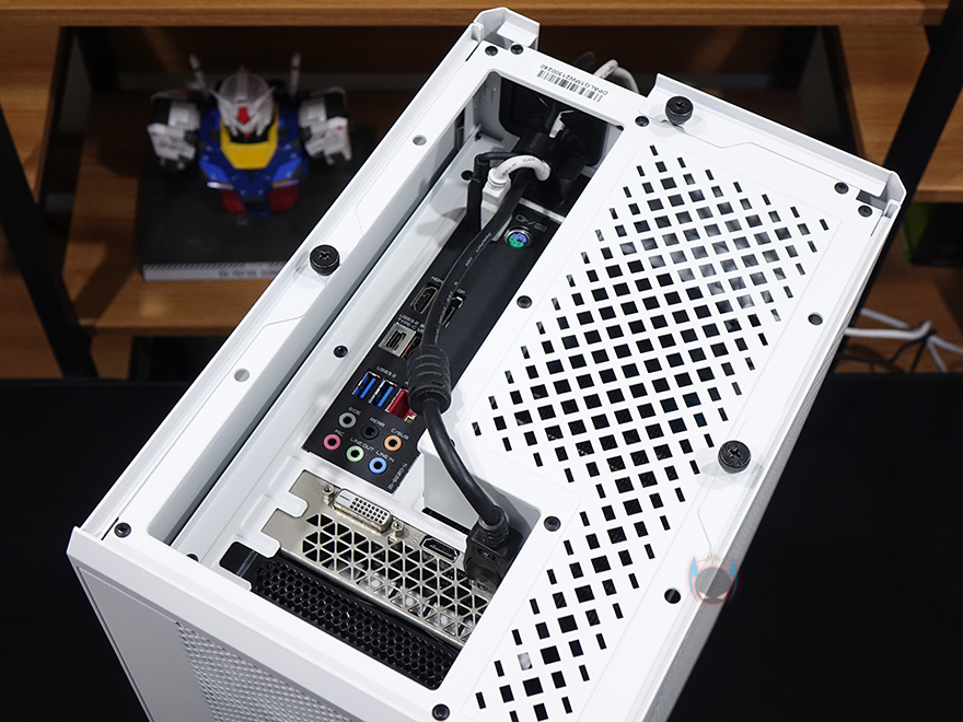 기본구성의 부품들을 모두 장착하고 나서, 케이블 정리까지 하면 조립이 끝나는데, 케이블 정리 같은경우에도 확실히 굴뚝형 ITX 케이스보다는 좀 더 커서 정리하는 공간이 좀 더 여유있어 수월하다 할 수 있으며, 케이스 상단으로 빠지는 백패널 I/O 포트에 연결된 케이블이나 모니터 케이블도 클램프로 쉽게 묶어서 배출할 수 있어서 편합니다. 또한, 조립 후 전원을 켜면 전원버튼에 화이트LED도 확인할 수 있죠. ITX 케이스보다는 좀 더 커서 확실히 굴뚝형 케이스라도 간섭이 적고, 조립도 전반적으로 수월한 편이라 할 수 있습니다.
