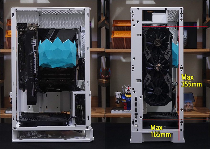그럼, 이제 실버스톤 ALTA G1M 케이스를 직접 사용해서 시스템 조립을 해봐야겠죠. 먼저, 파워서플라이경우 SFX 및 SFX-L 규격을 지원하는데, 최대 130mm 깊이 길이까지 지원하며 장착하기 전에, 연장 전원케이블을 먼저 파워서플라이에 장착하고, 그다음 밀어넣어서 장착합니다. 메인보드 같은경우에는 Micro-ATX 규격까지 장착이 가능하고, CPU 쿨러경우 높이는 최대 159mm까지로 실제 타워형쿨러 159mm 장착해 본 결과, 사이드패널의 브라켓을 사용하지 않으면 간섭없이 패널을 닫을 수 있는 것을 확인했습니다. 그리고, 그래픽카드경우 최대 355mm까지 지원하기때문에 시중에 판매되는 왠만한 그래픽카드들은 모두 장착이 가능하다 보면 됩니다. 참고로, 폭 160mm까지 지원한도 표기를 해놨는데, 아주 특별한 경우의 그래픽카드가 아니면 대부분 그래픽카드 폭이 140mm를 넘기는 경우는 거의 없기때문에 폭 크게 신경 쓰지 않아도 되겠습니다.