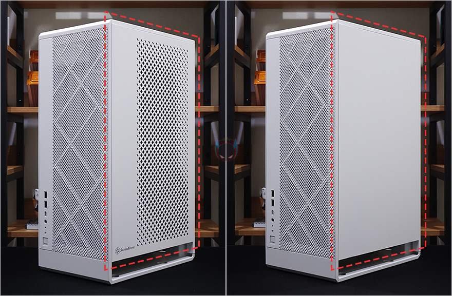ALTA G1M 케이스 사이드패널은 전면에서 봤을 때, 오른쪽패널은 전면과 비슷하게 한쪽에 여백을 두고 나머지는 메쉬 디자인의 에어홀처리를 해놨으며, 역시 가까이에서 보면 내부에 필터도 적용된 것을 확인할 수 있습니다. 참고로, 내부에 장착된 필더는 자석방식입니다. 그리고, 왼쪽패널은 그냥 민무늬 형태이고, 사이드패널 분리는 방금 앞에서 확인한 상단 베젤을 분리해서, 사이드패널을 고정해주는 핸드-스크류를 풀고 위로 올리면 쉽게 분리가 됩니다. 물론, 왼쪽패널과 오른쪽패널을 서로 바꾸어서 사용할 수 있죠.