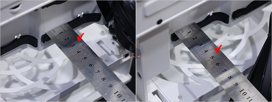 메인보드 트레이 후면에는 아랫공간에 케이블 정리 공간으로 중앙부분이 약 50mm정도로 가장 깊고, 양쪽으로 약 30mm 정도의 깊이를 가지고 있어서, 어느정도 케이블 정리를 하는데 있어서 도움이 될 것으로 생각되며, 내부 후면에는 추가적으로 팬이나 저장장치를 안쪽 방향에 장착할 수 있게 지원을 해주는, 팬 같은경우 120mm를 최대 2개까지 장착할 수 있고, 저장장치 경우 3.5인치 HDD와 2.5인치 HDD/SSD를 각각 최대 2개까지 장착할 수 있습니다. 물론, 팬과 저장장치 1개씩 함께 장착할수도 있죠. 그래서, 만약 타워형 쿨러를 사용한다면, 꼭 앞서본 사이드패널의 브라켓을 사용할 필요는 없겠습니다. 그리고, 맨 아래는 파워서플라이 자리로 Micro-ATX 메인보드가 장착되는 케이스지만 부피를 줄이기 위해 SFX 및 SFX-L 규격의 파워서플라이를 장착할 수 있게 지원하고 있죠. 끝으로, ALAT G1M 케이스에 사용된 샤시의 두께는 부위별로 측정한 결과 0.8~0.9T 두께로 미니타워 내구성을 위해 비교적 두꺼운 샤시를 사용했습니다.