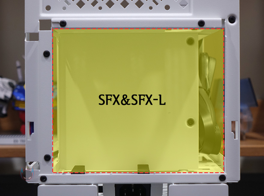 메인보드 트레이 후면에는 아랫공간에 케이블 정리 공간으로 중앙부분이 약 50mm정도로 가장 깊고, 양쪽으로 약 30mm 정도의 깊이를 가지고 있어서, 어느정도 케이블 정리를 하는데 있어서 도움이 될 것으로 생각되며, 내부 후면에는 추가적으로 팬이나 저장장치를 안쪽 방향에 장착할 수 있게 지원을 해주는, 팬 같은경우 120mm를 최대 2개까지 장착할 수 있고, 저장장치 경우 3.5인치 HDD와 2.5인치 HDD/SSD를 각각 최대 2개까지 장착할 수 있습니다. 물론, 팬과 저장장치 1개씩 함께 장착할수도 있죠. 그래서, 만약 타워형 쿨러를 사용한다면, 꼭 앞서본 사이드패널의 브라켓을 사용할 필요는 없겠습니다. 그리고, 맨 아래는 파워서플라이 자리로 Micro-ATX 메인보드가 장착되는 케이스지만 부피를 줄이기 위해 SFX 및 SFX-L 규격의 파워서플라이를 장착할 수 있게 지원하고 있죠. 끝으로, ALAT G1M 케이스에 사용된 샤시의 두께는 부위별로 측정한 결과 0.8~0.9T 두께로 미니타워 내구성을 위해 비교적 두꺼운 샤시를 사용했습니다.