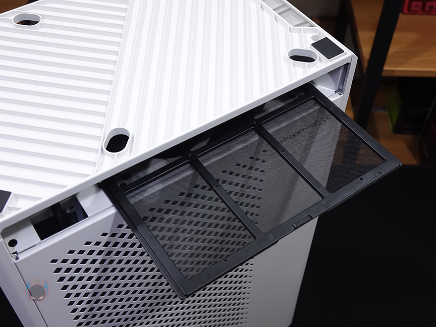 케이스 후면에는 전체적으로 메쉬(Mesh) 디자인을 적용하고 있는데, 맨 윗부분 오른쪽에는 메인보드 백패널 I/O가 상단에 배치되기때문에 키보드나 마우스, 모니터케이블 등을 후면으로 빼낼 수 있게 홀-처리를 해놨으며, 맨 아랫부분에는 전원케이블과 연결되는 포트가 배치되어 있습니다. 그리고, 후면 패널 역시 상단에서 고정된 핸드-스크류를 풀고 위로 올리면 쉽게 분리가 되죠. 역시 안쪽에는 필터가 적용되어 있습니다. 그리고, 케이스 밑바닥부분에는 미끄럼방지 및 진동소음 최소화를 위해 모서리 부근에 고무패드를 부착해놨으며, 밑바닥부분은 사실상 전체가 받침대 역할로 약 35mm 정도 공간을 두고 있습니다. 이 공간을 통해 하단 쿨링효과를 보는거죠. 그리고, 당연히 필터도 적용되어 있는데, 슬라이드 방식으로 쉽게 빼낼 수 있습니다.