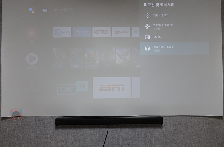 필자의 경우는 이 도시바 TS205 사운드바를 최종적으로 빔프로젝터에 연결해서 사용했는데, 앞서 부속품에서 벽에 걸 수 있는 월마운트 브라켓을 제공해주고 있어서, 브라켓을 벽에 먼저 고정한 다음, 사운드바 후면 양쪽에 있는 기본 나사를 풀고, 벽걸이를 할 수 있게 해주는 나사로 교체해줍니다. 그리고, 브라켓에 걸면 마무리가 되죠. 요즘 대부분의 빔프로젝터 제품들은 블루투스 지원을 갖추고 있기때문에, 역시 TS205를 블루투스로 연결해서 사용하면 되고, 빔프로젝터에 내장된 사운드보다 확실히 사운드출력이 높아서 영상을 보는데 체감을 더 높여줍니다.