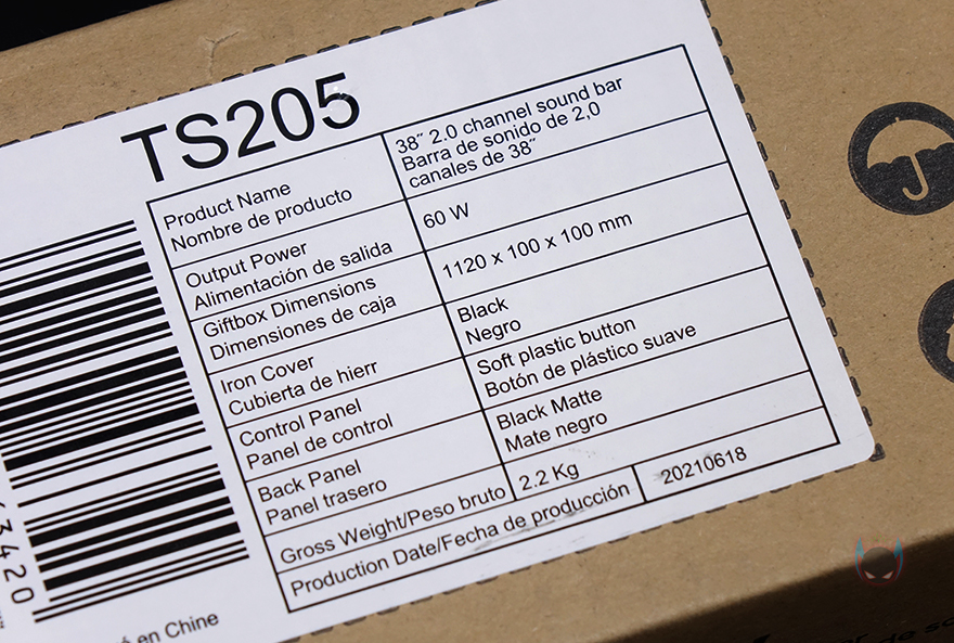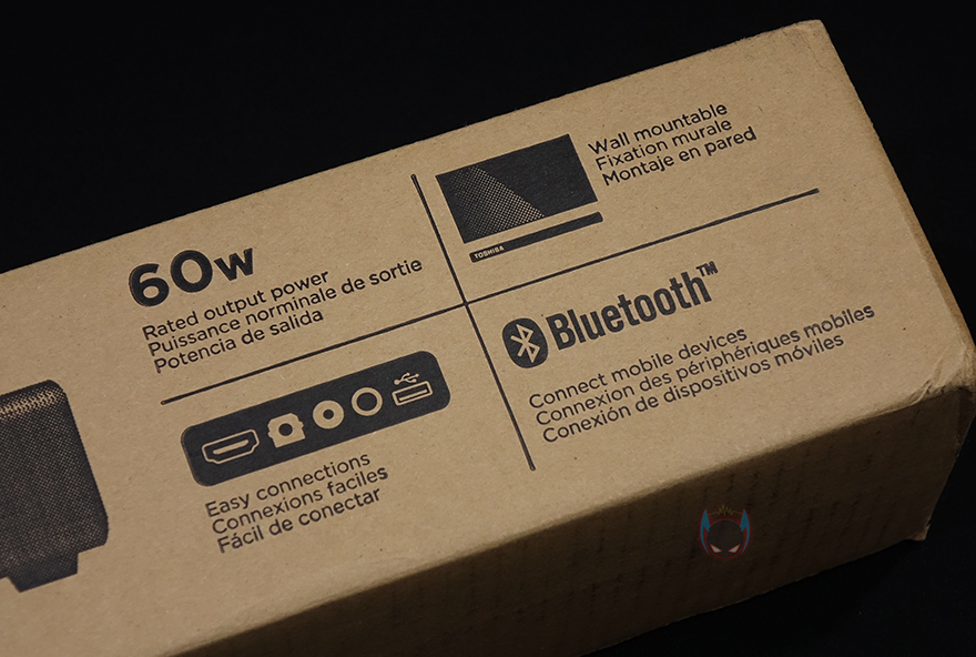 사운드바 제품이기때문에, 제품박스는 다른 제품들처럼 긴 박스형태인데, 길이는 1120mm입니다. 전후면에는 동일하게 제품 이미지와 함께 모델명, 제품의 주요 특징으로 60W 사운드출력, 벽걸이 지원, 다양한 입력단자 지원, 블루투스 지원 표기를 확인할 수 있죠. 또한, 배송이나 제품 이동시 편의를 위해 손잡이도 적용되어 있으며, 한쪽에는 제품팩키지 표기도 해놨습니다.