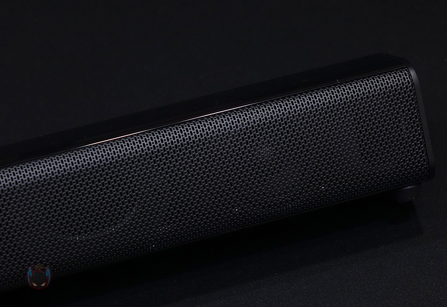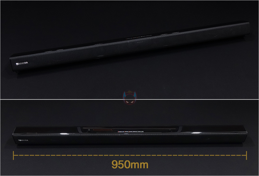 도시바 TS205 사운드바 외형을 살펴보면, 일단 길이는 950mm로 앞서 제품박스에서 38인치 사운드바라는 표기를 확인할 수 있었는데, 일반적으로 TV와 함께 사용할 때 이정도 길이면, TV는 최소 43인치(약 960mm)부터 사용하는게 비율적으로 어울린다할 수 있죠. 쉽게말해, TV보다 사운드바 길이가 짧아보여야 보기에 어색하지 않다라는겁니다. 좀 더 자세히 살펴보면, 전면에는 전체 메쉬 디자인과 함께 왼쪽에는 네임플레이트식으로 로고를 부착해놨으며, 내부에는 양쪽으로 각각 30W씩 사운드 출력이 되게 풀-레인지 스피커 2개가 적용되어 있습니다. 그래서, 총 60W 출력을 하는거죠.