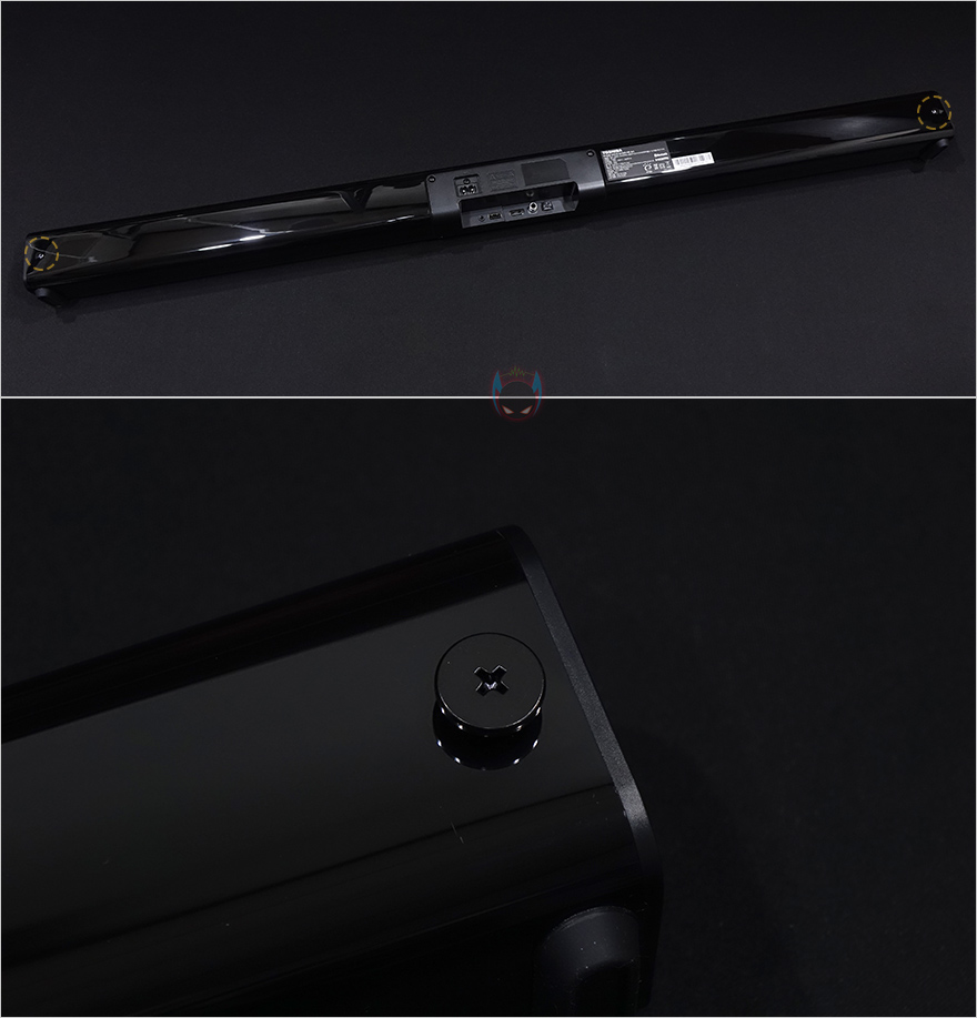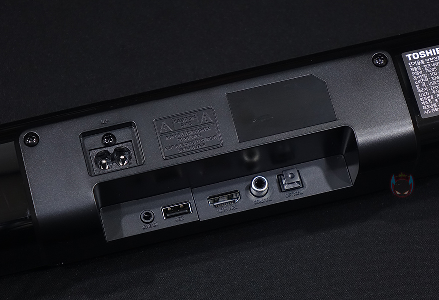 제품 후면에는 전원케이블과 연결되는 포트를 비롯해, 왼쪽부터 AUX, USB, HDMI ARC, 광(Optical), 동축(Coaxial) 입력 단자순으로 배치되어 있죠. 사용자 환경에 맞게 연결할 수 있도록 다양하게 단자 지원을 갖추었습니다. 물론, 블루투스 지원도 하기때문에 꼭 유선으로만 연결할 필요는 없습니다. 그리고, 밑바닥부분에는 진동소음 최소화를 위해 양쪽에 고무재질의 받침대도 부착되어 있습니다. 무선 리모컨 같은경우에는 전원부터 음소거/단자선택/블루투스/볼륨조절/재생컨트롤/EQ 기능까지 담고 있어서, 본체에 적용된 버튼들도 훨씬 사용하기가 수월하며, 건전지(CR2025)도 기본 포함되어 있죠.