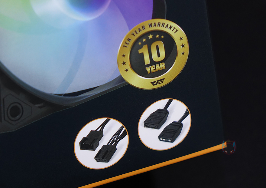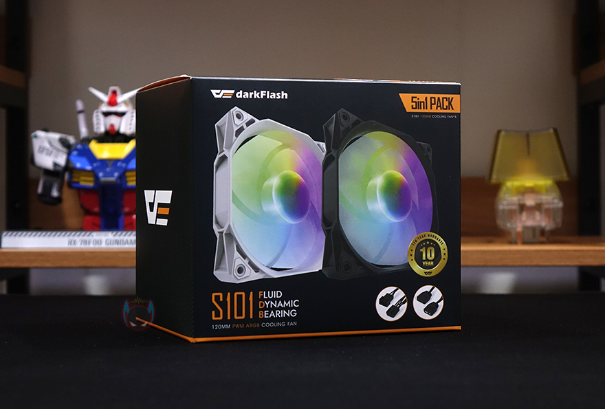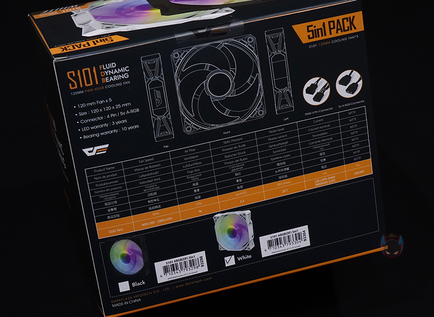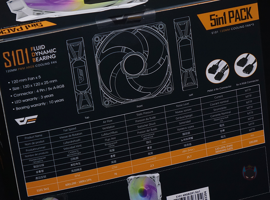 제품팩키지부터 살펴보면, 이번 다크플래쉬 S101 FDB ARGB 팬은 다른 경쟁사 제품들처럼 1개로 판매되는 싱글 제품과 5개 묶음으로 판매되는 팩키지 제품 2가지로 출시되었습니다. 리뷰에선 5개가 들어있는 5in1 Pack 제품을 살펴보는데, 박스 상단과 전면에는 제품 이미지를 담고 있으며, 모델명과 함께 10년 무상 보증기간을 확인할 수 있습니다. 10년 무상보증기간이면 현재 ARGB 팬에서는 가장 긴 보증기간이기도 하죠. 그리고, 모델명의 FDB는 바로 유체 동압 베어링 표기의 약자를 의미합니다. 일반적으로 유체 베어링 방식은 볼 베어링 방식보다 마찰과 소음이 적은 것이 특징입니다.