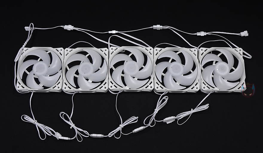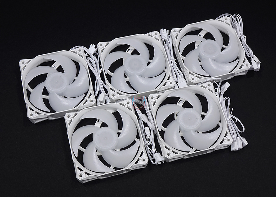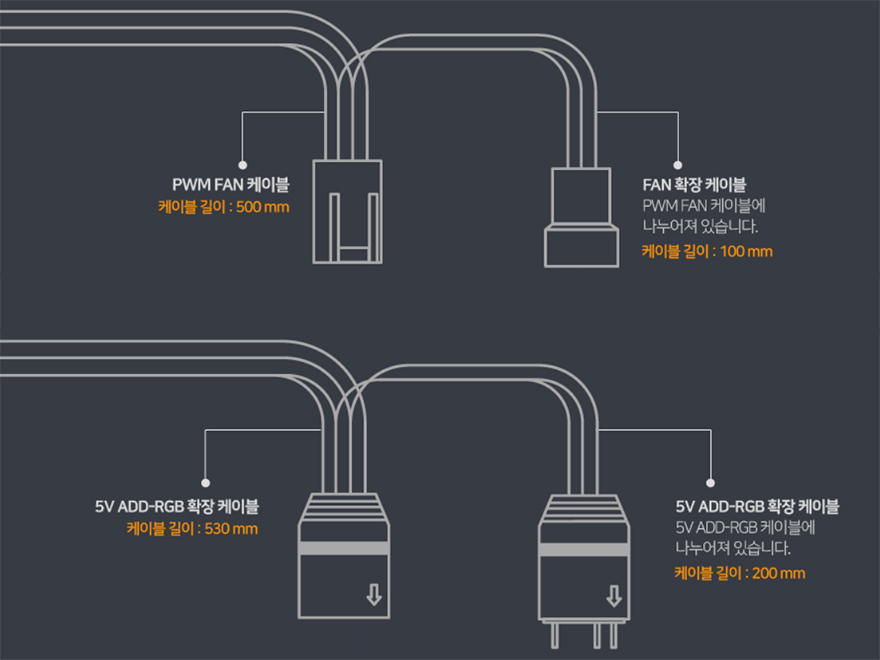 끝으로, 케이블 경우는 다른 RGB 팬들과 마찬가지고 팬 작동의 케이블과 RGB 작동의 케이블 2가지로 연결되어 있으며, 모두 플랫(Flat) 타입니다. 또한, 팬 케이블의 경우 앞서 언급했듯이 연결방식은 PWM 4핀 방식이고, 팬과 팬을 서로 연결할 수 있게, 확장케이블도 함께 연결되어 있죠. 물론, RGB 케이블 역시 5V의 3핀 방식으로 역시 팬과 팬의 RGB를 서로 연결할 수 있게 확장케이블이 연결되어 있습니다. 참고로, 팬 케이블 길이는 기본 500mm에 확장 100mm이고, RGB 케이블은 기본 530mm에 확장 200mm 입니다.