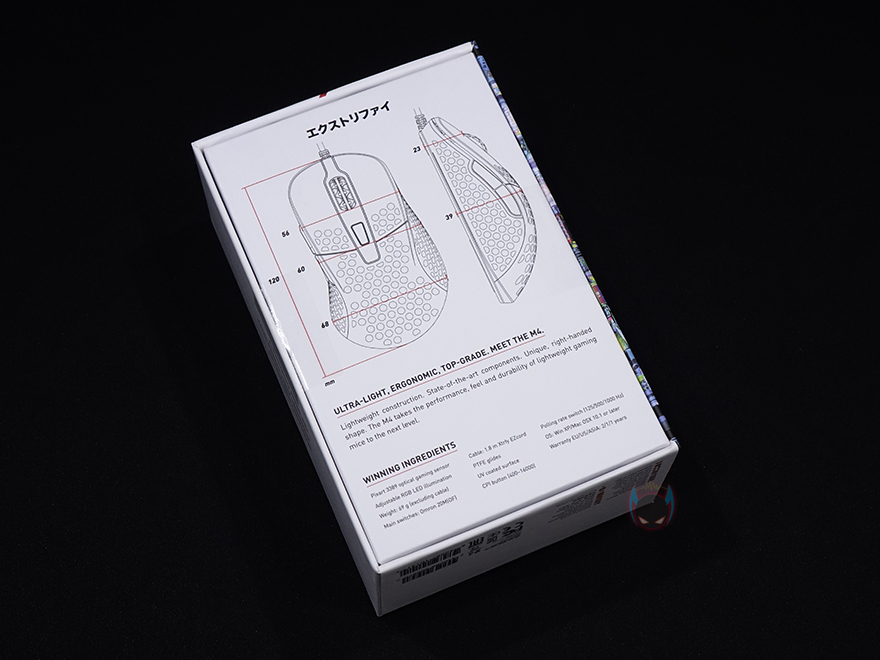 박스 후면에는 제품의 사이즈를 그림과 함께 알아보기 쉽게 해놨으며, 제품의 기본사양 표기도 해놨는데, 센서, 무게, 스위치, 케이블길이 등을 미리 알 수 있습니다. 박스를 열어보면, 제품 포장은 흔들리지않게 틀-방식으로 포장된 것을 확인할 수 있으며, 제품구성은 M4 도쿄에디션 마우스, 키-캡 2개, 봉투 구성을 먼저 확인할 수 있고, 봉투안에는 제품설명서와 로고 스티커, 여분의 교체용 테프론-피트가 들어있습니다. 키-캡은 일종의 포인트 키-캡으로 기계식키보드를 사용하고 있다면 교체해서 사용할 수 있습니다. 물론, Xtrfy(엑스트리파이)에도 프로젝트4 제품군으로 키보드 제품이 있고, 국내에서도 판매중입니다.