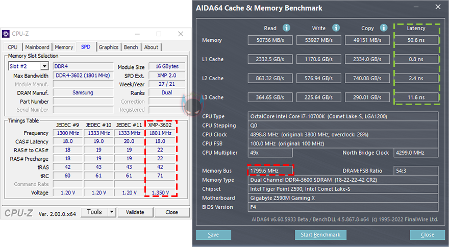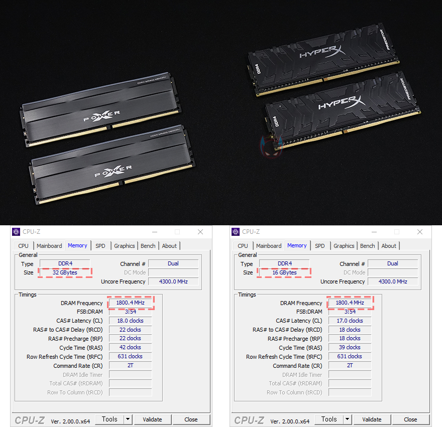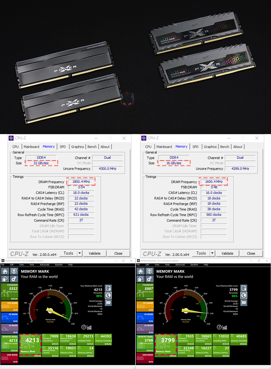 그리고, XPOWER Zenith RGB DDR4 메모리는 현재 3200MHz와 3600MHz 2가지 클럭으로 출시가 되었는데, 리뷰에 사용된 제품은 3600MHz 작동 제품으로 다시말해, XMP 프로파일이 적용되어 있습니다. 물론, XMP 프로파일은 일종의 오버클럭이기때문에 메인보드 CMOS에서 설정값을 불러와 적용해줘야하는데, 그전에 기본작동 클럭을 확인해보면, 2666MHz으로 작동되는 것을 확인할 수 있죠. 그래서, 기본작동될때 클럭과 메인보드 CMOS에서 XMP 프로파일을 불러와 3600MHz으로 오버클럭했을 때, 성능을 간단히 비교해보면, 성능이 빨라진 것을 확인할 수 있습니다.