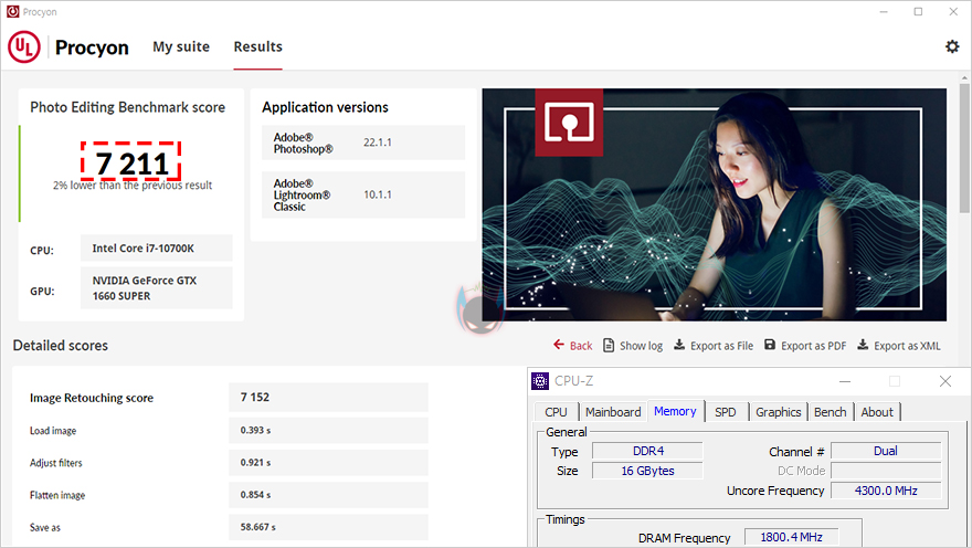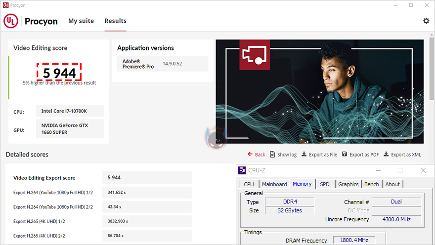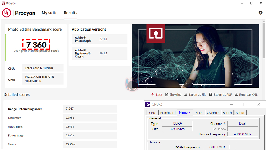 이번에는 클럭(3600MHz)은 같고, 용량만 다른 상태에서 비교를 해보는데, 일반적으로 메모리 용량의 영향을 많이 받는 경우는 편집작업 환경으로 대표적인 작업이라 할 수 있는 Adobe의 사진작업 Photoshop과 Lightroom, 그리고 비디오편집 작업인 Premiere Pro 프로그램으로 동일한 작업 환경에서 벤치마크 할 수 있는 Procyon 벤치마크를 통해 용량에 따른 성능을 확인해 본 결과, 메모리 용량이 더 많은 XPOWER Zenith RGB 메모리가 더 좋은 결과값을 보여줬습니다. 클럭이 전체적인 성능을 주는 것도 있지만, 용량도 작업환경에 따라선 큰 영향를 주기때문에, 단일 메모리로 최대 16GB용량까지 나온 XPOWER Zenith RGB 메모리는 충분히 매력이 있다할 수 있겠습니다.