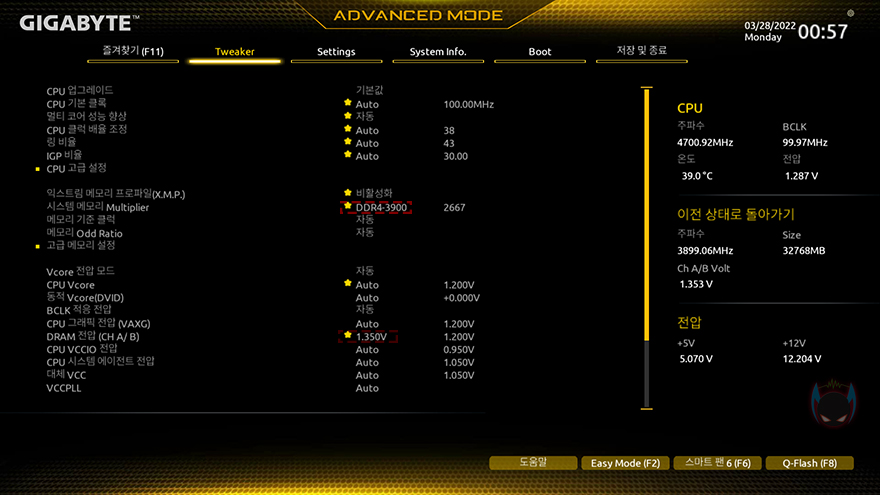 끝으로, XPOWER Zenith RGB DDR4 메모리가 XMP 프로파일을 적용하고 있어서, 사실상 오버클럭이 이미 적용된 상태지만, 메모리들은 수동으로도 사용자가 오버클럭을 할 수 있기때문에, Zenith RGB 메모리의 추가 오버클럭 여부를 확인해봤습니다. 확인결과, XMP 프로파일과 전압은 1.35V로 그대로 유지한 상태에서 최대 3900MHz까지 오버클럭이 가능한 것을 확인할 수 있었습니다.