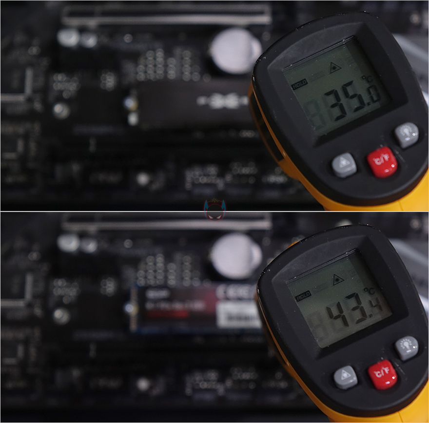 끝으로, 두 제품을 과부하 시키는 작업에서 비접촉식으로 온도를 체크해봤는데, XPOWER XD80는 약 35℃, UD70은 약 44℃ 가량으로 측정되는 것을 확인할 수 있었습니다. 물론, 실제온도는 이보다 좀 더 높게 나오기 때문에, 온도차이는 좀 더 크다 할 수 있겠습니다. 따라서, 두 제품 모두 PCIe3.0x4 규격으로 고속 전송을 지원한다라는 점에서, 발열이 생길 수 밖에 없는데, 이때, 방열판이 있고없고의 효과는 XPOWER XD80을 통해서 쉽게 확인할 수 있습니다.