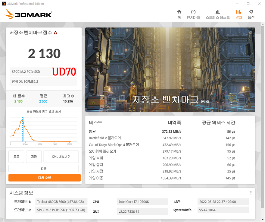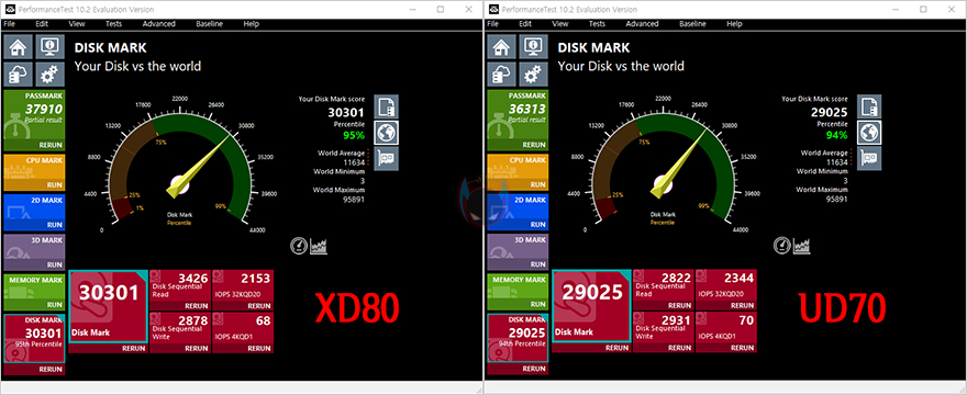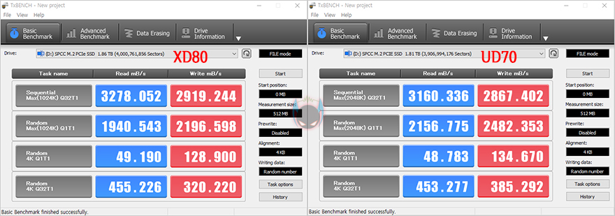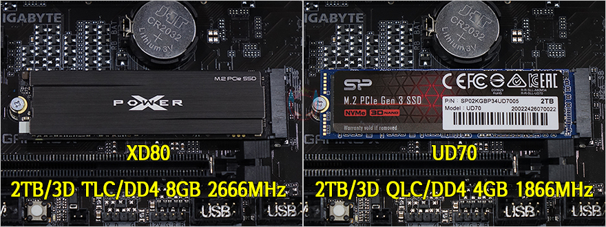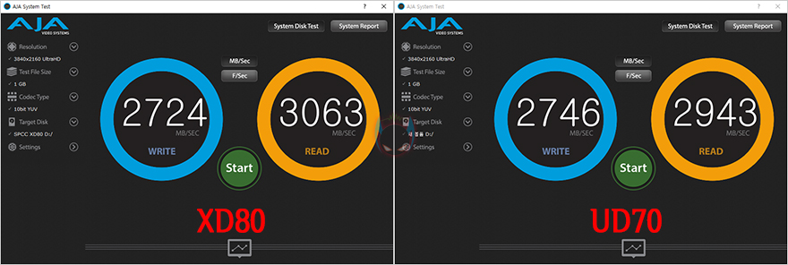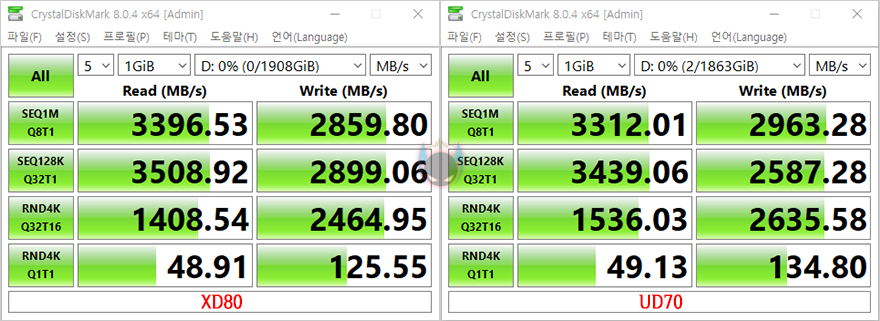 그리고, 리뷰에 사용된 제품은 2TB 용량이기때문에, 이왕 동일한 용량은 가진 자사의 UD70과 본격적인 성능비교를 해볼텐데, 참고로, 두 제품이 동일하게 PCIe 3.0x4 규격과 용량이 같아도, 낸드플래시와 DRAM에서 차이를 두고 있습니다. 그래서, 실제 벤치마크 프로그램을 통해 성능을 비교해보면, CrystalDiskMark에서나 TxBench, Passmark의 DISK 측정, AJA System Test에서 XPOWER XD80이 UD70보다는 전체적으로 조금 더 좋은 결과값을 보여줍니다. 특히, 게임환경에서의 두 제품의 벤치마크를 비교해보면, 좀 더 확실히 XPOWER XD80이 대역폭에서 앞선다라는 것을 확인할 수 있죠. 그래서, 용량이 같더라고, 낸드플래시 메모리 타입이나 DRAM의 용량과 클럭에 따라서 성능차이가 있다라는 결론을 얻을 수 있겠습니다.