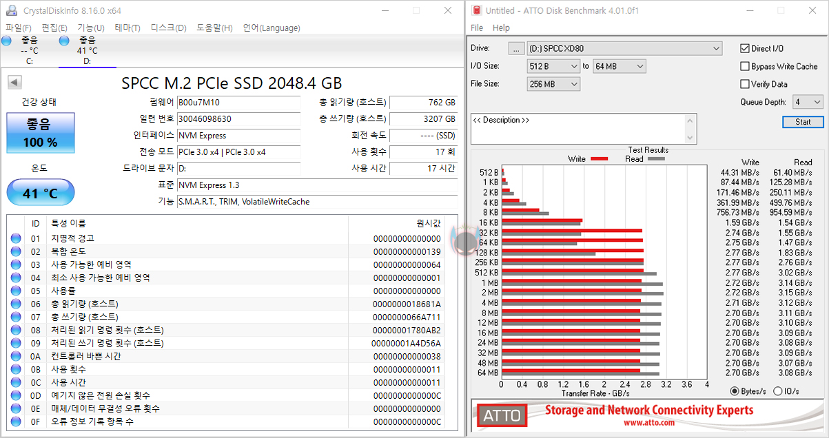 직접, 실리콘파워 XPOWER XD80 SSD를 사용해보면, 인터페이스 규격은 PCIe 3.0x4 방식으로 스펙상의 최대 읽기와 쓰기는 각각 3,400MB/s, 3,000MB/s입니다. 일단, CrystalDiskInfo를 통해 좀 더 정보를 얻어보면, NVMe 1.3 버전, TRIM 등의 기능도 적용된 것을 확인할 수 있고, ATTO Disk Benchmark로 간단히 성능확인을 해보면, 스펙상의 표기보다는 조금 낮게 측정되는 것을 확인할 수 있는데, 이는 다른 SSD 제품들을 사용해도 비슷한 결과를 보여주기때문에, 특별히 문제될 부분은 아닙니다.