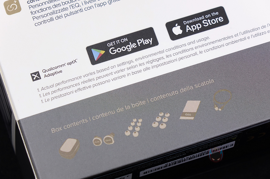 이밖에 박스측면에는 방금 언급했던 주요 특징 사용시간과 ANC 지원 외에도 10mm 드라이버유닛 사용의 추가 문구도 확인할 수 있으며, 박스 후면에는 마이크와 어플(App) 지원 등 주요 특징들을 상세하게 다시 설명표기해놓은 것을 확인할 수 있습니다. 그리고, 어플 지원표기와 함께 맨 아래에는 제품 구성 목록도 확인할 수 있죠. 제품 개봉은 슬라이드 방식으로 속박스가 적용된 형태이며, 속박스 뒷면에 다시한번 씰(seal)처리를 해놨죠. 다시한번 꽤나 제품포장부터 신경썼다라는 것을 알 수 있습니다.
