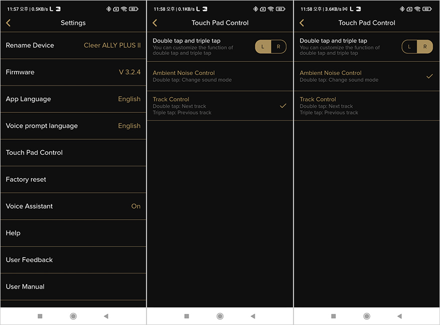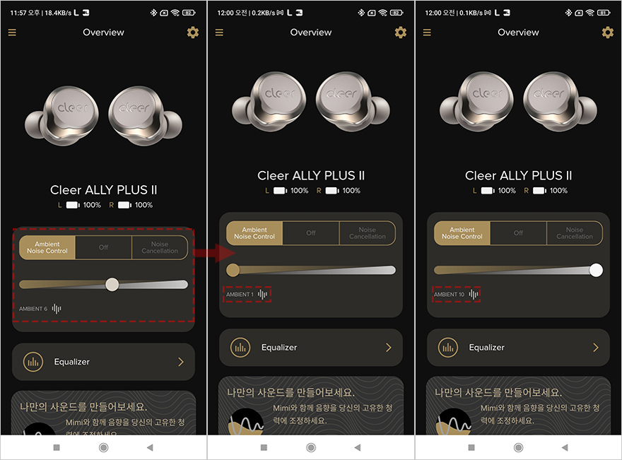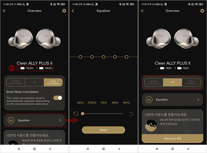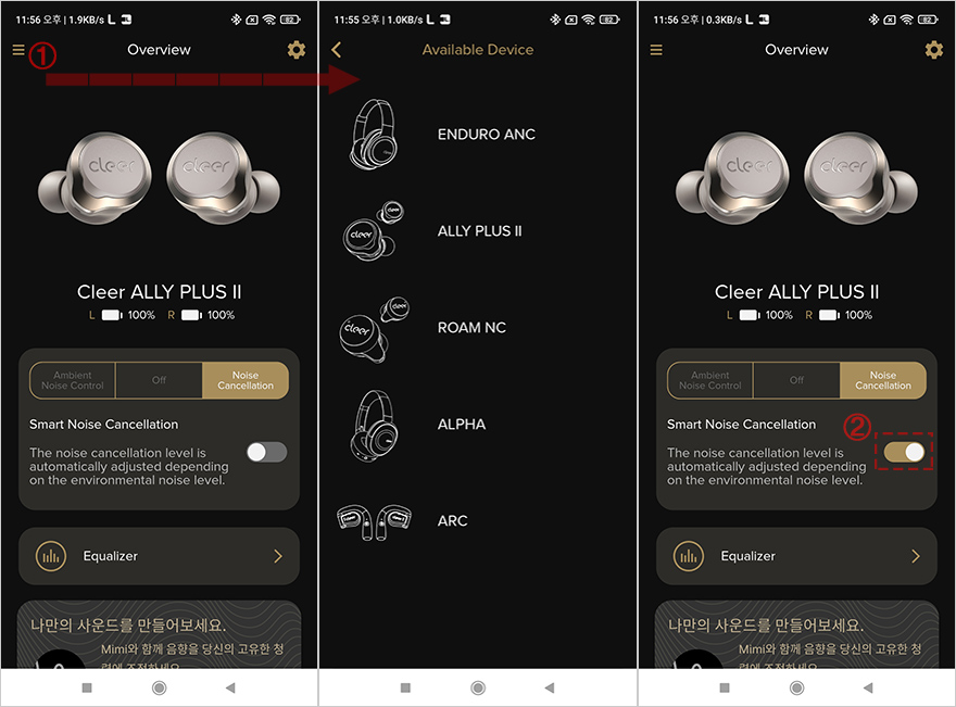 Cleer+ 어플을 좀 더 살펴보면, 일단 기기가 연결된 상태의 메인화면에서 맨 왼쪽 메뉴판으로 들어가면 Cleer+ 어플을 지원해주는 다른 제품들 목록을 확인할 수 있습니다. 그리고, 메인 화면에선 이어폰의 배터리 잔량표시와 함께 액티브 노이즈 캔슬링(ANC)을 주변 환경에 맞춰 자동 조절되게 활성/비활성화 선택할 수 있으며, 이어폰 배터리 잔량표시부분도 한 번 터치하면 사용시간 표시로 바꿔 보여줍니다. 이 외에도 메인화면 아래에는 이퀄라이저 기능도 제공해주고 있는데, 사용자가 직접 주파수 대역을 조절하는 방식으로 실제 사용해보면 사운드 음역대가 달라지는 것을 체감할 수 있습니다. 그리고, 이어폰을 착용한 상태에서 주변 사람과 대화할 수 있게 대화모드 그러니깐 주변 소음이 더 잘 들리게 해주는 대화모드(Ambient Noise Control)도 지원해주고 있는데, 1단계~10단계로 조절할 수 있습니다. 이 외에도, 어플 설정(Setting) 메뉴로 들어가면 펌웨어 업데이트부터 공장초기화, 모바일기기 음성서비스 On/Off, 이어폰 자체 음성 언어지원, 어플 언어지원, 터치방식 설정 등을 확인할 수 있는데, 터치방식은 좌우 이어폰을 각각 더블과 트리플 탭 중에 선택할 수 있습니다. 참고로, 어플 언어와 이어폰 자체 언어 지원은 영어와 중국어만 지원해주고 있습니다.