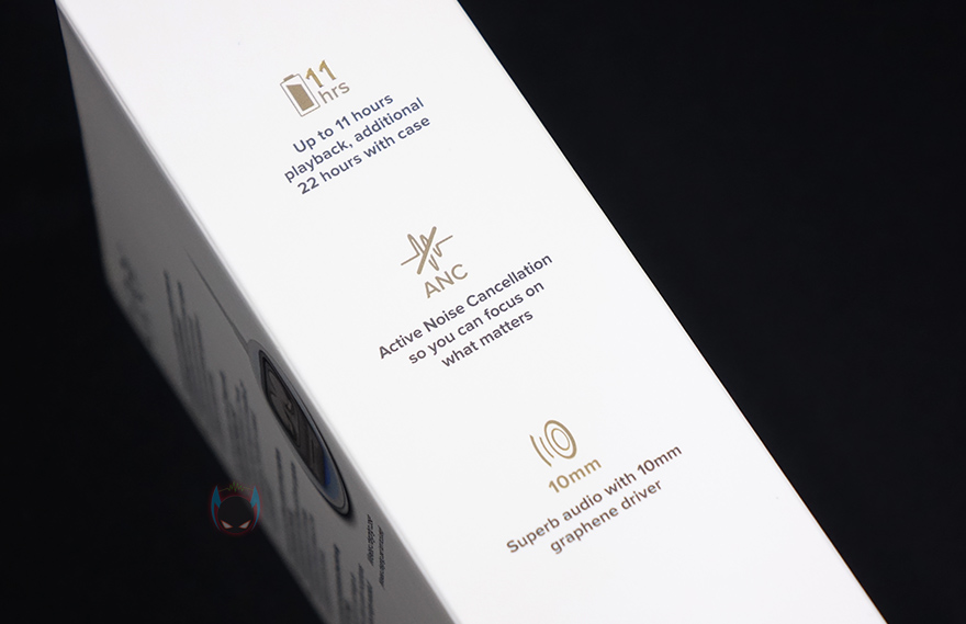 이밖에 박스측면에는 방금 언급했던 주요 특징 사용시간과 ANC 지원 외에도 10mm 드라이버유닛 사용의 추가 문구도 확인할 수 있으며, 박스 후면에는 마이크와 어플(App) 지원 등 주요 특징들을 상세하게 다시 설명표기해놓은 것을 확인할 수 있습니다. 그리고, 어플 지원표기와 함께 맨 아래에는 제품 구성 목록도 확인할 수 있죠. 제품 개봉은 슬라이드 방식으로 속박스가 적용된 형태이며, 속박스 뒷면에 다시한번 씰(seal)처리를 해놨죠. 다시한번 꽤나 제품포장부터 신경썼다라는 것을 알 수 있습니다.