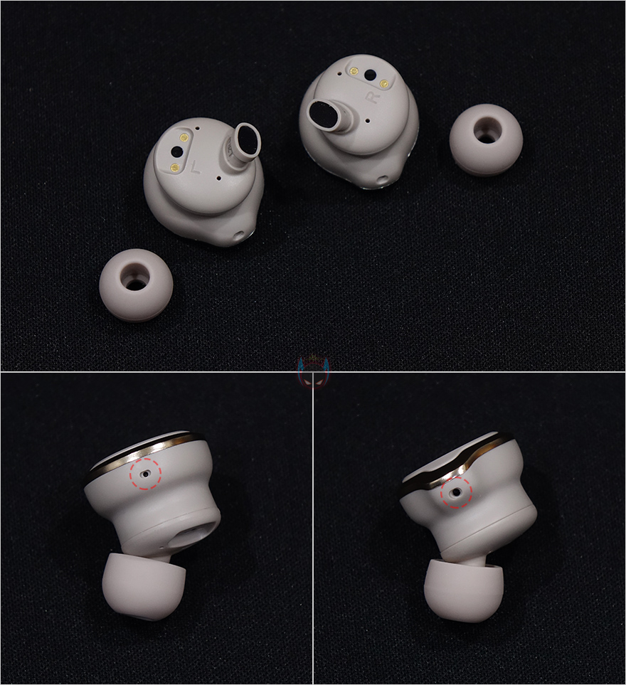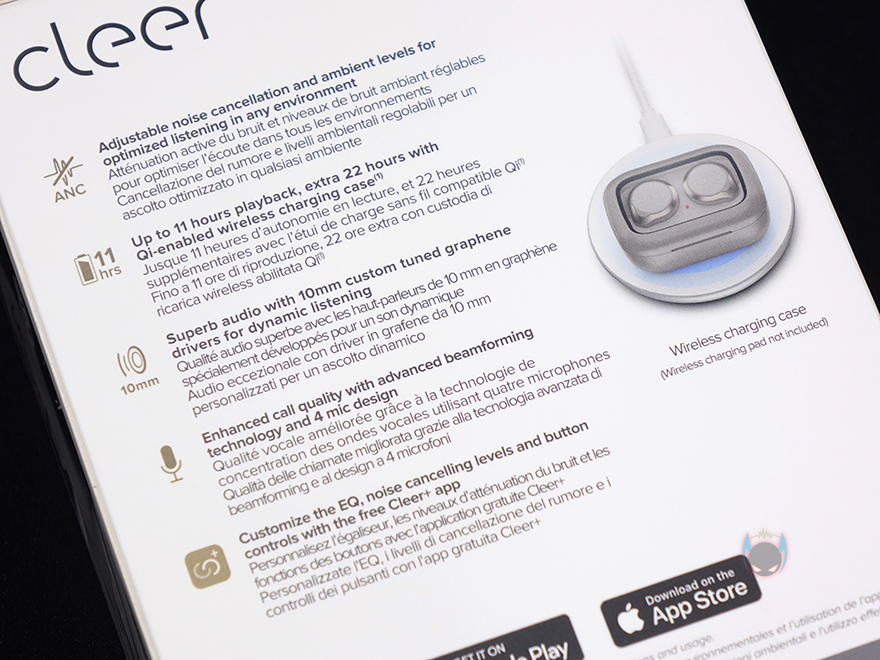 Ally Plus 2 무선이어폰의 충전케이스를 열어보면, 다른 제품들처럼 일정 각도까지는 손으로 열다가 나머지부분은 반자동으로 열립니다. 닫기는것도 마찬가지죠. 기준은 약 45℃가량정도입니다. 뚜껑을 열면, 내부에 수납된 이어폰을 확인할 수 있고, 꺼내서 이어폰을 살펴보면, 개봉시에는 배터리 소모가 되지않게 충전케이스와 접지되는 이어폰부분에 보호비닐이 부착되어 있죠. 이어폰 바깥쪽에는 'Cleer' 문구를 새겨놨으며, 문구부분이 터치 컨트롤부분이기도 합니다. 이어폰 형태는 커널형으로 앞서 언급했듯이 기본 장착된 이어-팁은 둥근 원형의 중간(M) 사이즈이며, 내부에는 10mm 드라이버 유닛이 탑재되어 있죠. 그리고, 이어폰 테두리 주변 위아래에는 각각 마이크가 2개씩 총 4개가 적용되어 있는데, 퀄컴 cVC 8세대로 액티브 노이즈 캔슬링(ANC)이 함께 적요된거죠.