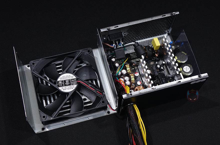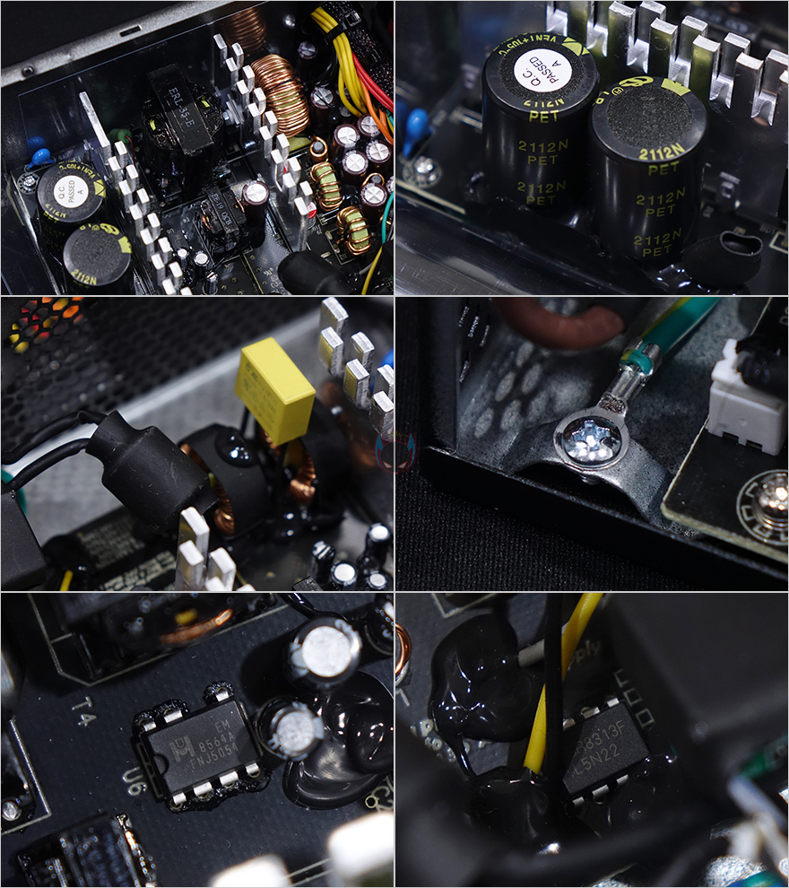 쿨맥스 VISION 2 파워서플라이 내부를 잠깐 살펴보면, 기본 장착된 120mm 팬은 VISION 1때와 마찬가지로 HDB(유압식 베어링)팬을 사용하고 있으며, DWPH사의 팬으로 스펙상 최대속도는 2400RPM입니다. 또한, 내부 구성을 좀 더 살펴보면, 내부 발열 해결을 위한 알루미늄 히트싱크와 안정적인 전력공의 스위칭트랜스, 그리고 이전 VISION 1때와 동일하게 대만산 메인캐패시터를 사용했는데, 한가지 다른 점이라면, VISION 1 모델에선 85℃ 제품을 사용한 반면, 이번 VISION 2에선 좀 더 고온에서 견딜 수 있는 105℃ 제품을 사용했습니다. 그리고, 고주파음 최소화를 위한 EMI 필터, 내부 전류흐름방지의 접지, 보호회로 칩셋들도 확인할 수 있죠.