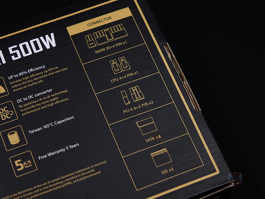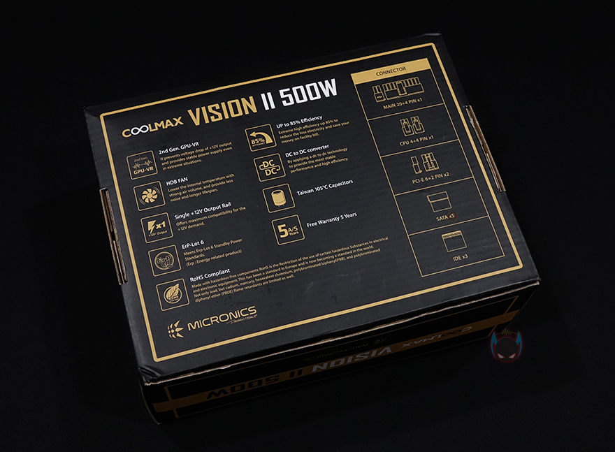 박스 후면에는 방금 언급했던 제품의 주요 특징들을 좀 더 상세하게 표기하고 있으며, 추가로 +12V 싱글레일, 대기전력 인증, RoHS 인증 언급을 확인할 수 있습니다. 그리고, 오른쪽에는 커넥터 지원표기도 확인할 수 있는데, 참고로 500W 모델은 이전 모델과 동일하게 지원하고 있습니다. 제품구성은 VISION 2 파워서플라이, 제품설명서, 전원케이블, 장착에 필요한 나사, 소량의 케이블타이 제공으로 이루어져 있죠.