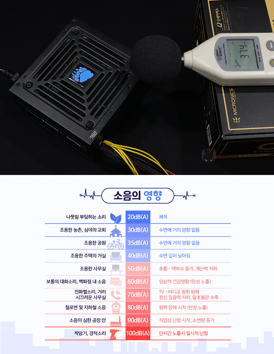 끝으로, 쿨맥스 VISION 2 파워서플라이의 팬 소음을 측정해봤는데, 기본 작동상태에서 측정한 결과 약 37dB(A) 수준으로 실생활 기준에서 보면 매우 정숙한 수준임을 확인할 수 있습니다. 실제로 PC케이스 내부에 장착해서 사용했을 때는 이보다 더 작게 들리기 때문에, 팬 소음에 대한 우려는 하지않아도 되겠습니다.