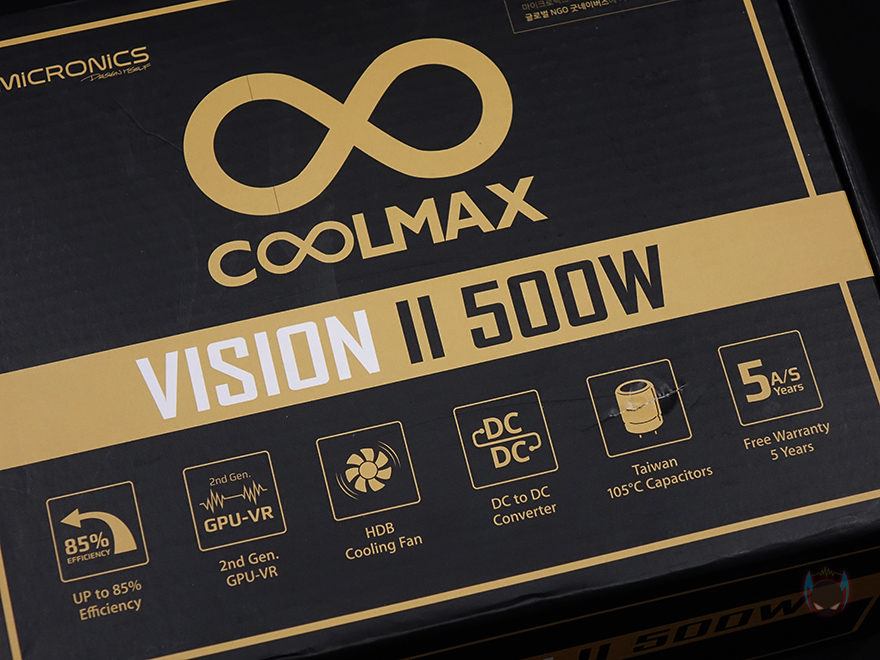 제품박스부터 살펴보면, 전면에는 쿨맥스 로고와 함께 모델명, 그리고 용량표기, 제품의 주요 특징을 표기해놨는데, 참고로 용량은 이전 VISION 1 모델과 마찬가지로 500/600/700W 용량이 나왔으며, 추가로 800W 용량이 출시될 예정입니다. 그리고, 제품의 주요 특징으로는 85%의 전력효율, 2세대 GPU-VR 탑재, HDB 팬, DC-to-DC 컨버터, 대만 105℃ 메인캐패시터, 5년 무상보증을 확인할 수 있는데, 첫 번째 VISION 1과의 차이점은 전력효율과 2세대 GPU-VR 탑재, 메인캐패시터입니다. 이부분은 뒤에서 다시 언급하겠습니다. 그리고, 박스 한쪽 측면에는 해당 용량 모델의 기본사양표기를 해놨죠.