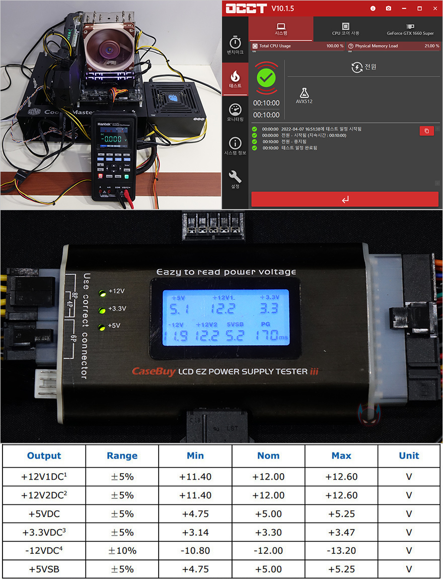 실제로 마이크로닉스 쿨맥스 VISION 2 파워서플라이를 사용해보면, 일단 기본 작동상태에서 전압 출력상태는 인텔 파워서플라이 가이드 표준 범위에서 정상적으로 출력되는 것을 확인할 수 있습니다. 그리고, 실제 PC 시스템에서 OCCT 프로그램을 통해 과부화 Load 상태일때와 Idle 상태일때 12V와 5V의 전압 움직임을 측정해봤는데, 주요 전력공급 전압인 12V의 경우 Idle에선 0.01V 수준으로 Load에선 변동이 없는 칼전압 상태를 보여줬습니다. 이런 칼전압 수준은 역시 이전 VISION 1 모델에선 없었던 2세대 GPU-VR이 이번 VISION 2 모델에 탑재되었기 때문이죠. 또한, 5V 역시 Idle과 Load 전체 변동폭이 0.01V 수준으로 매우 낮아서, 두 전압 모두 매우 안정적인 출력상태를 보여줍니다. 그리고, 이전 VISION 1 모델과 마찬가지로 이번 VISION 2 모델도 80Plus 인증을 받지 않았지만, 자사 자체 효율로 85%의 전력효율을 언급하고 있는데, 이 역시 이전 VISION 1때보다 1% 향상된 효율입니다.
