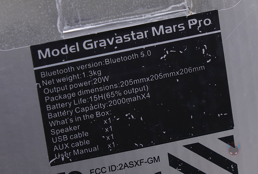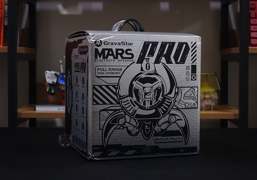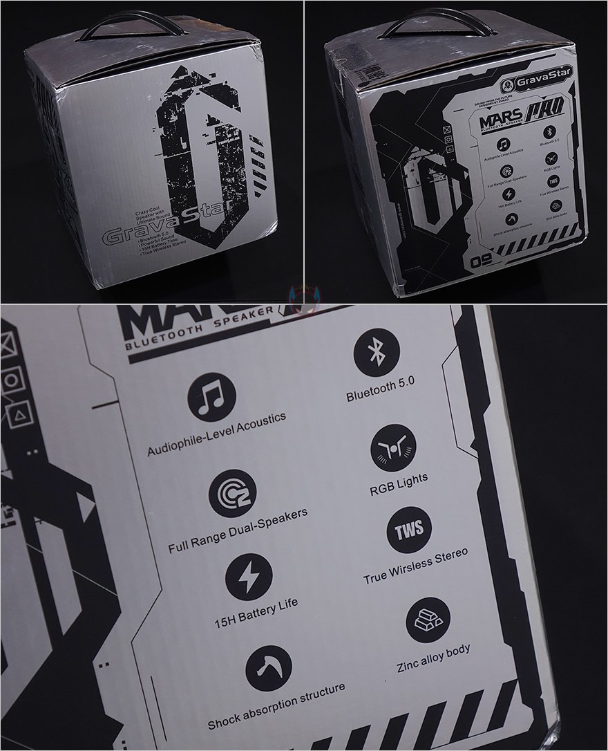 제품박스는 은색배경으로 이동시 편의를 위해 박스 손잡이가 있으며, 전면에는 그림형식으로 Mar Pro 디자인을 담고 있습니다. 이전 모델인 Mars 스피커를 알고 있었던 소비자라면, 그림 디자인만 봐도 Mars Pro 스피커의 디자인이 기존 Mars에서 크게 달라지지 않았다라는 것을 짐작할 수 있죠. 그래도, 모델명과 함께 시작에서 언급한 Mars Pro의 주요 특징 듀얼-스피커(Dual-Speakers) 문구를 확인할 수 있으며, 박스 한쪽 측면에는 추가로 애호가 수준의 음향, 블루투스 5.0, RGB 조명, 15시간 배터리, TWS, 충격 흡수 구조, 아연합금바디(Zinc Alloy body) 표기를 확인할 수 있습니다. Gravastar하면 아연합금(Zinc Alloy) 소재가 빠질 수 없죠.