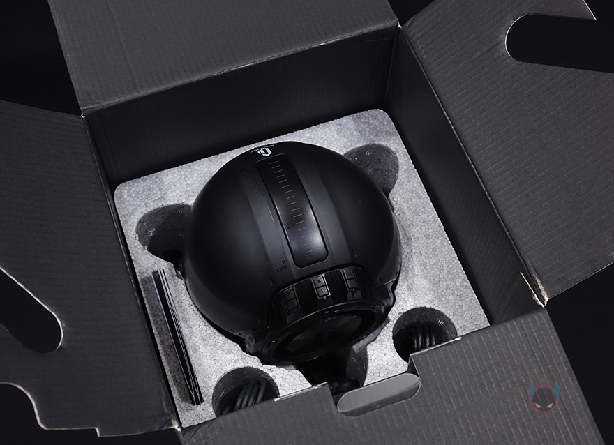 그리고, 박스 후면에는 간략하게 제품의 기본사양 표기를 해놨는데, 1.3kg 무게, 20W 사운드출력, 사이즈, 2000mah 배터리 4개, 제품구성 목록을 추가로 확인할 수 있습니다. 박스를 열어보면, 외부 충격 파손방지를 위해 스티로폼 포장재를 사용했으며, 스피커와 부속품들이 흔들리지 않게 틀-방식으로 포장되어 있습니다. 제품구성은 Mars Pro 스피커, USB 충전케이블, AUX 케이블, 제품설명서로 이루어져 있습니다.