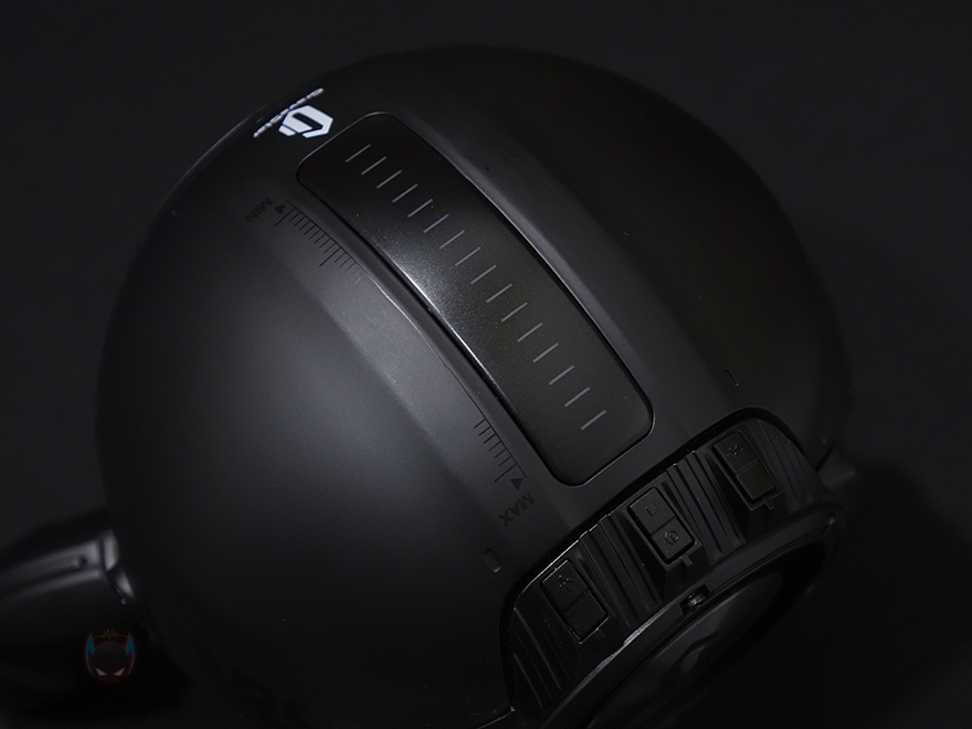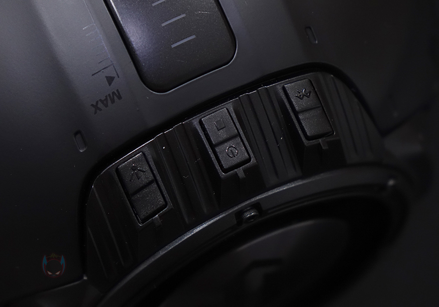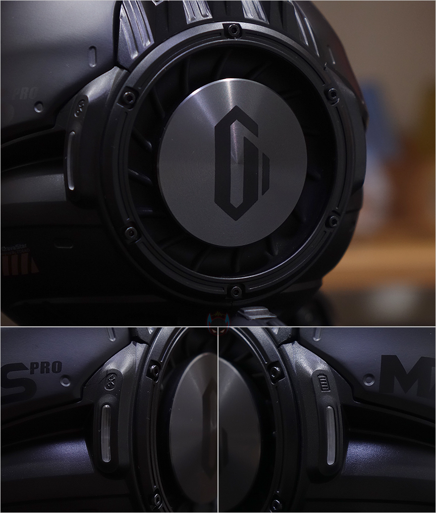 그리고, 후면 베이스 스피커 역할을 해주는 패시브 라디에이터는 이전 Mars 스피커와 동일한 디자인을 갖추고 있으며, 양쪽 측면에 각각 블루투스 작동상태와 배터리 잔량상태를 확인할 수 있게 인디케이터(Indicator)를 적용하고 있습니다. 물론, RGB 조명효과로 보여줍니다. 그리고, 후면 바로 윗부분에는 이전 Mars 스피커와 마찬가지로 버튼이 배치되어 있는데, 대신 이전 Mars 스피커처럼 단순 인쇄표시가 아닌 버튼 자체에다가 양각으로 표시 처리를 해놨습니다. 기능은 동일하게 가운데 버튼은 전원 및 재생/일시정지, 오른쪽 버튼은 블루투스 페어링, 왼쪽 버튼은 조명모드 전환 기능입니다. 참고로, 블루투스와 조명 버튼을 함께 누르면 리셋(Reset) 기능이 되고, 블루투스와 전원버튼 5초간 누르면 연결해제를 해줍니다.