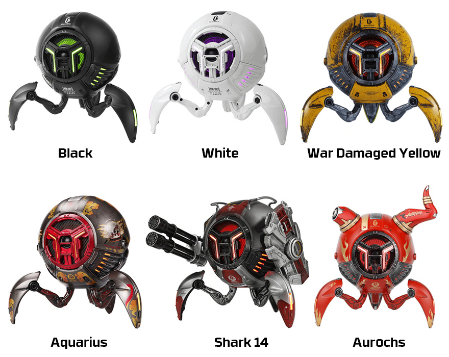 본격적으로 Gravastar Mars Pro 스피커를 살펴보면, 전반적인 디자인은 기존의 Mars 스피커에서 크게 벗어나지 않습니다. 하지만, 색상 모델이 기본 블랙(Black)과 화이트(White)를 비롯해, 수공예(Handmade Craft) 모델 War Damaged Yellow, Shark 14, Aurochs, Aquarius까지 더 다양해졌습니다. 정확히는 이전 Mars보다 수공예 모델이 더 많아졌죠. 물론, Mars때와 마찬가지로 기본 색상모델보다 수공예 모델이 가격은 더 비쌉니다.