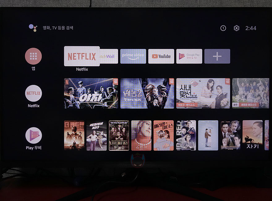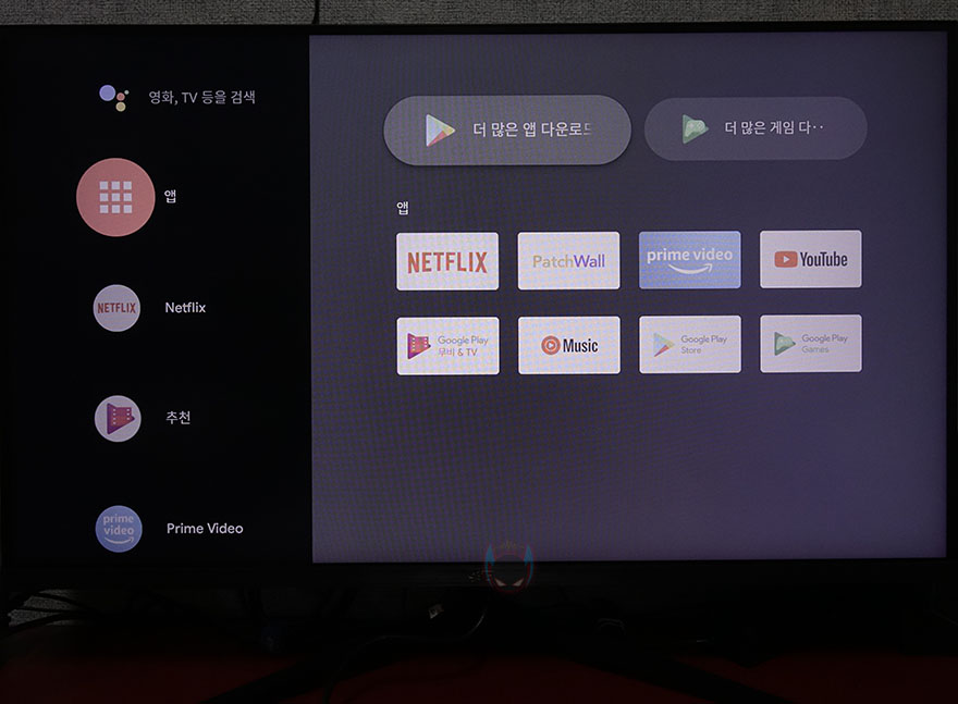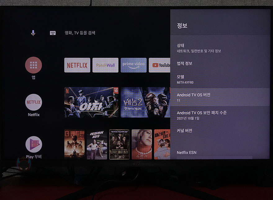 기본설정이 끝난 후 실행되는 기본화면 인터페이스는 안드로이드TV 인터페이스와 동일하며, 익숙한 화면이기때문에 사용에 불편함은 없으며, 설정 메뉴로 들어가서 안드로이드TV 운영체제 버전을 확인해보면, 안드로이드TV 11버전이 적용되었음을 확인할 수 있습니다. 참고로, 스마트폰의 안드로이드 운영체제와 TV의 안드로이드 운영체제는 조금 차이를 두고 있기때문에, 구글 스토어를 통해 설치할 수 있는 어플 지원이 다를 수 있습니다. 그리고, 스마트TV처럼 리모컨에서 구글 어시스턴트 음성서비스를 바로 이용할 수 있고, 유튜브나 넷플릭스, 아마존 프라임 같은 프로그램 이용도 회원가입 후 로그인하면 이용할 수 있죠. 물론, 일부는 유료 비용이 발생하죠. 시작에서도 언급했듯이 요즘은 대부분 스마트TV로 제품을 내놓기 때문에, 이렇게 모니터 같은 제품에 연결해서 사용하는 TV스틱이 좀 더 활용있다 할 수 있겠습니다.