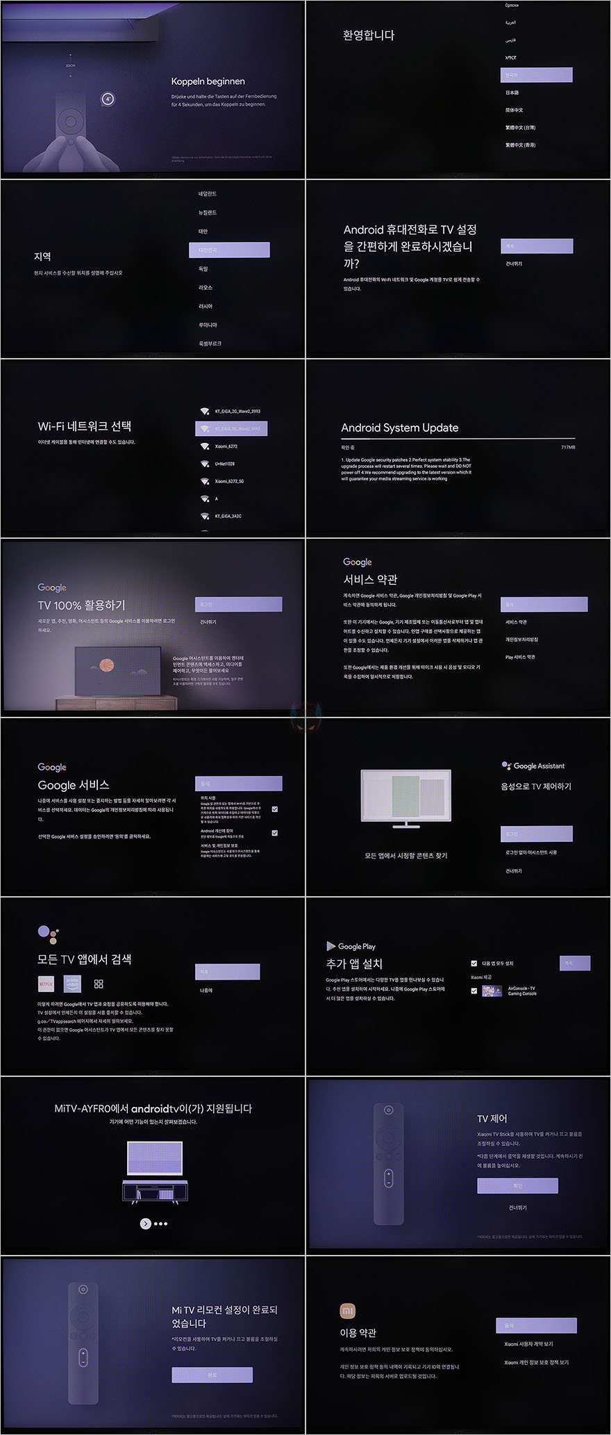 실제로 샤오미 미 스틱 4K TV스틱을 사용해보면, 별도의 전원버튼이 없기때문에, 전원케이블을 포트에 연결하면 바로 전원이 들어와서 작동이 시작되며, 로고 부팅이 지나고나면, 초기설정단계가 시작되는데, 안드로이드 운영체제의 스마트폰이나 TV를 사용해봤던 이용자라면 익숙한 화면입니다. 물론, 한국어 지원도 해주기때문에 초보자도 쉽게 진행에 따라 설정하면 됩니다. 물론, 샤오미 제품이기때문에, 설정 끝부분에는 추가적으로 제공되는 샤오미 어플 지원 설치여부도 확읺라 수 있죠.